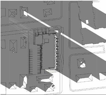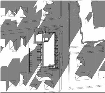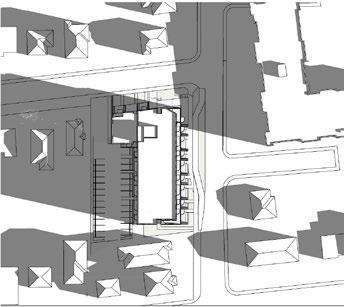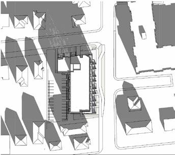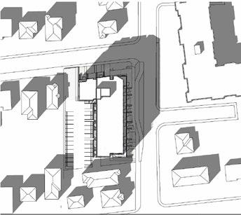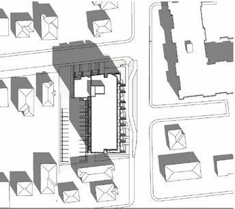 between the building and neighbouring properties, effectively reducing shadowing, particularly in the afternoon and evening, with most shadows falling within the site itself or onto adjacent streets.
