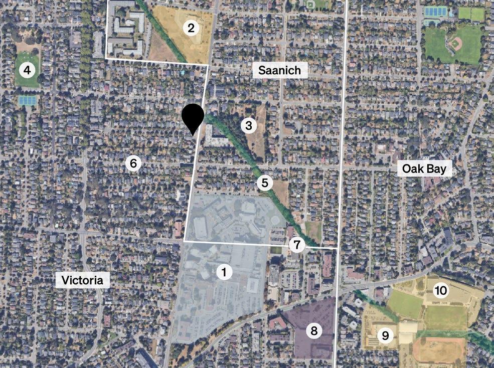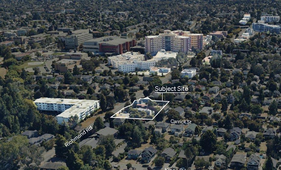 Located at the corner of Richmond Road and Carrick Street, the site at 2612–2628 Richmond Road comprises four existing properties—three singlefamily homes and one mixed-use commercial building—all fronting Richmond Road. Situated within the North Jubilee neighbourhood, the site benefits from a fine-grained urban fabric composed of residential and mixed-use buildings surrounding the Royal Jubilee Hospital, with convenient access to nearby amenities that support daily life. This area also functions as a key junction linking the adjacent municipalities of Saanich and Oak Bay.