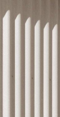 The middle section is wrapped in bold, corrugated fibre cement panels that interact with sunlight to create depth and shadow. The upper levels feature grooved fibre cement panels with a rilled finish, adding a sense of refinement and lightness to the stepped-back volume.