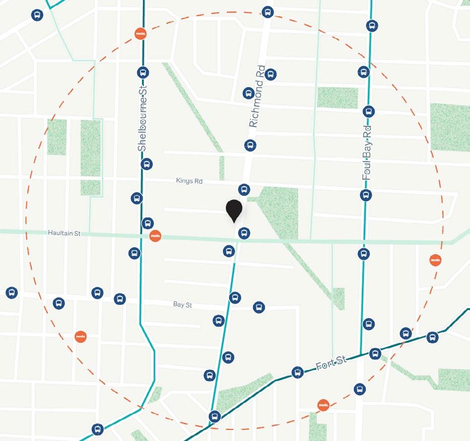 The proposed development is located in a highly accessible, multi-modal transportation area that supports walking, cycling, and transit. Within a 5–10 minute walk, future residents can access daily needs like groceries, parks, medical services, and the Royal Jubilee Hospital. The site is served by several BC Transit routes, including the frequent #14 and local #8 on Richmond Rd, with connections to UVic, Downtown, and surrounding neighbourhoods. The cycling network includes painted bike lanes on Richmond and Shelbourne, protected lanes on Fort Street, and the nearby Haultain shareduse bikeway. Additionally, the project benefits from proximity to Victoria’s Greenways Network such as Bowker Creek Greenway and the Haultain Greenway, which prioritize walking and Mobility Context