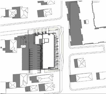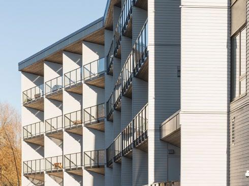 both the site’s urban context and solar orientation. Key design elements— including a broken roofline and stepped balconies along Richmond Road and Carrick Street—help to establish a more human-scaled presence. The L-shaped configuration increases the distance