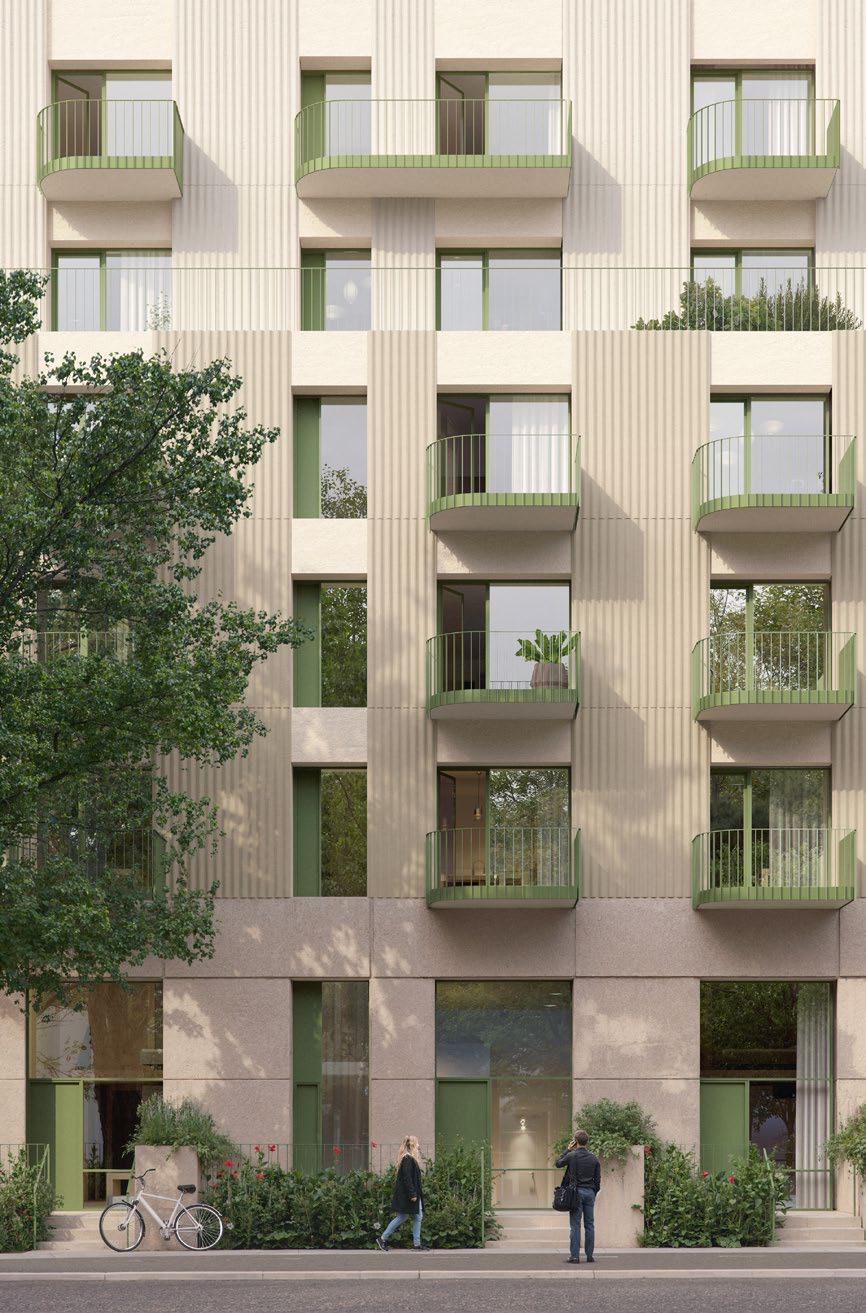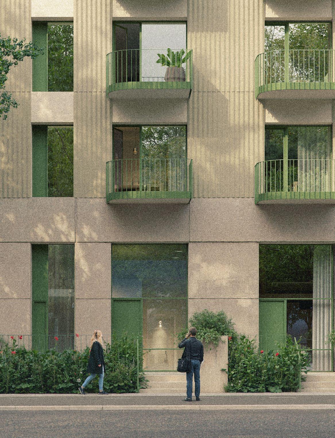 The exterior design and material palette build upon a carefully considered composition that responds thoughtfully to the surrounding context. The design strategy centers on two primary themes: the composition and proportion of window openings and balconies, and the tone and texture of the façade materials.
