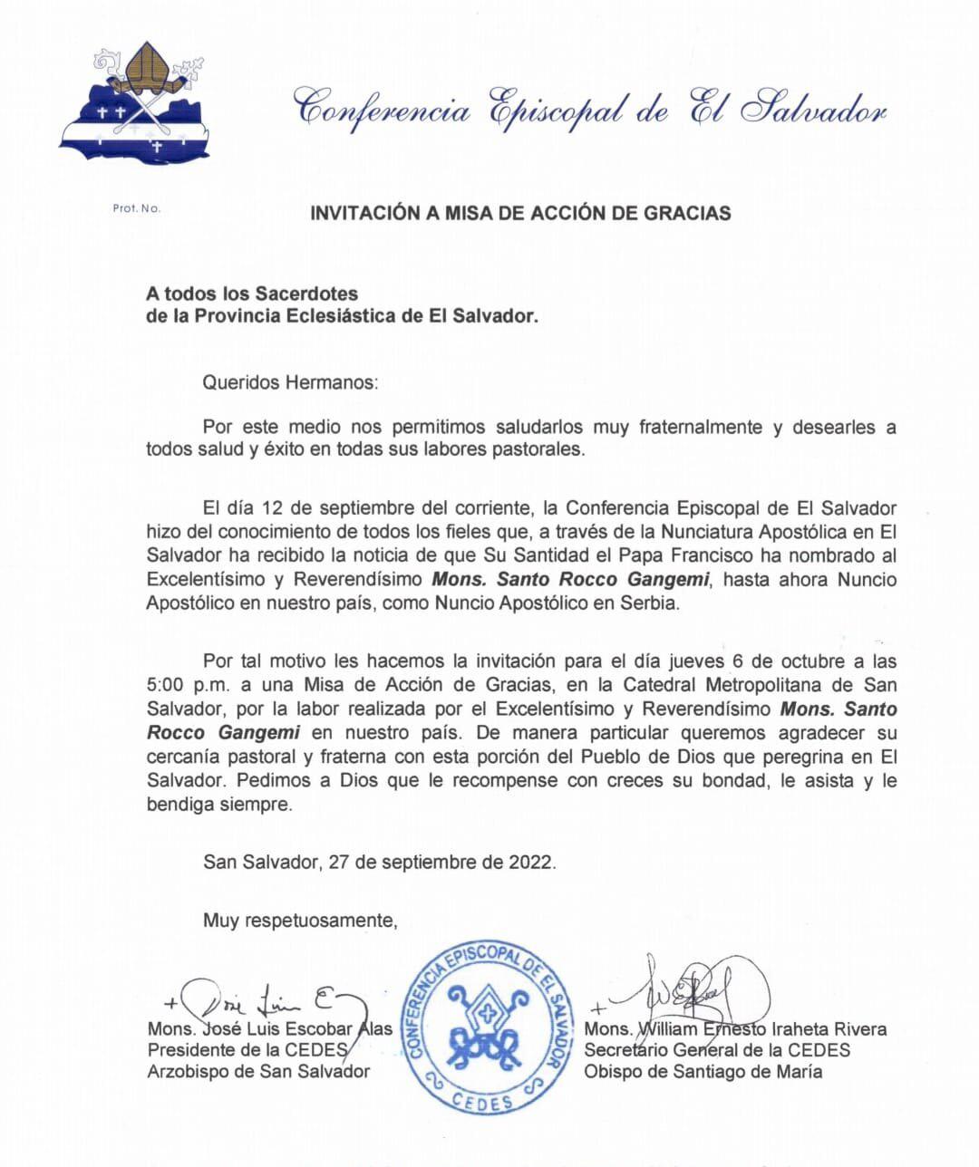 El recién pasado lunes 12 de septiembre, el Vaticano publicó que el Señor Nuncio Apostólico, Mons. Santo Rocco Gangemi, Nuncio en nuestro país, ha sido nombrado Nuncio en la República de Serbia. Agradecemos al Señor Nuncio Santo Rocco Gangemi su gran bondad durante toda su misión y felicitamos su excelente desempeño en favor de nuestro país. Le encomendamos al Señor, suplicándole le acompañe y le asista con su Santo Espíritu en su nueva misión. Tendremos una solemne eucaristía con el Señor Nuncio Apostólico, concelebraremos con él todos los obispos de El Salvador, están invitados también los sacerdotes de todo el país, las hermanas religiosas, hermanos religiosos, hermanos laicos y todos los que deseen acompañarnos, la Santa Misa será aquí en esta catedral, el próximo 06 de octubre a las 05.00 p.m. Todos estamos invitados.