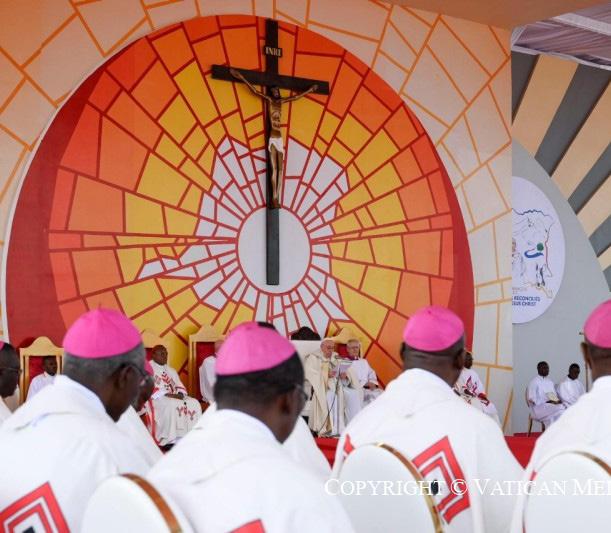 a las otras autoridades del país por la acogida que me reservaron. Inmediatamente después de mi llegada, en el Palacio Presidencial, pude dirigir el mensaje a la nación: el Congo es como un diamante, por su naturaleza, por sus recursos, sobre todo por su gente; pero este diamante se ha convertido en motivo de contiendas, de violencias, y paradójicamente de empobrecimiento del pueblo. Es una dinámica que se encuentra también en otras regiones africanas, y que vale en general para ese continente: continente colonizado, explotado, saqueado. Frente a todo esto dije dos palabras: la primera es negativa, “¡basta!”, ¡basta de explotar África! He dicho otras veces que en el inconsciente colectivo está “África debe ser explotada”: ¡basta con esto! Dije eso. La segunda es positiva: juntos, juntos con dignidad, todos juntos, con respeto recíproco, juntos en el nombre de Cristo, nuestra esperanza, ir adelante. No explotar e ir adelante juntos. Y en el nombre de Cristo nos hemos reunido en la gran Celebración eucarística.