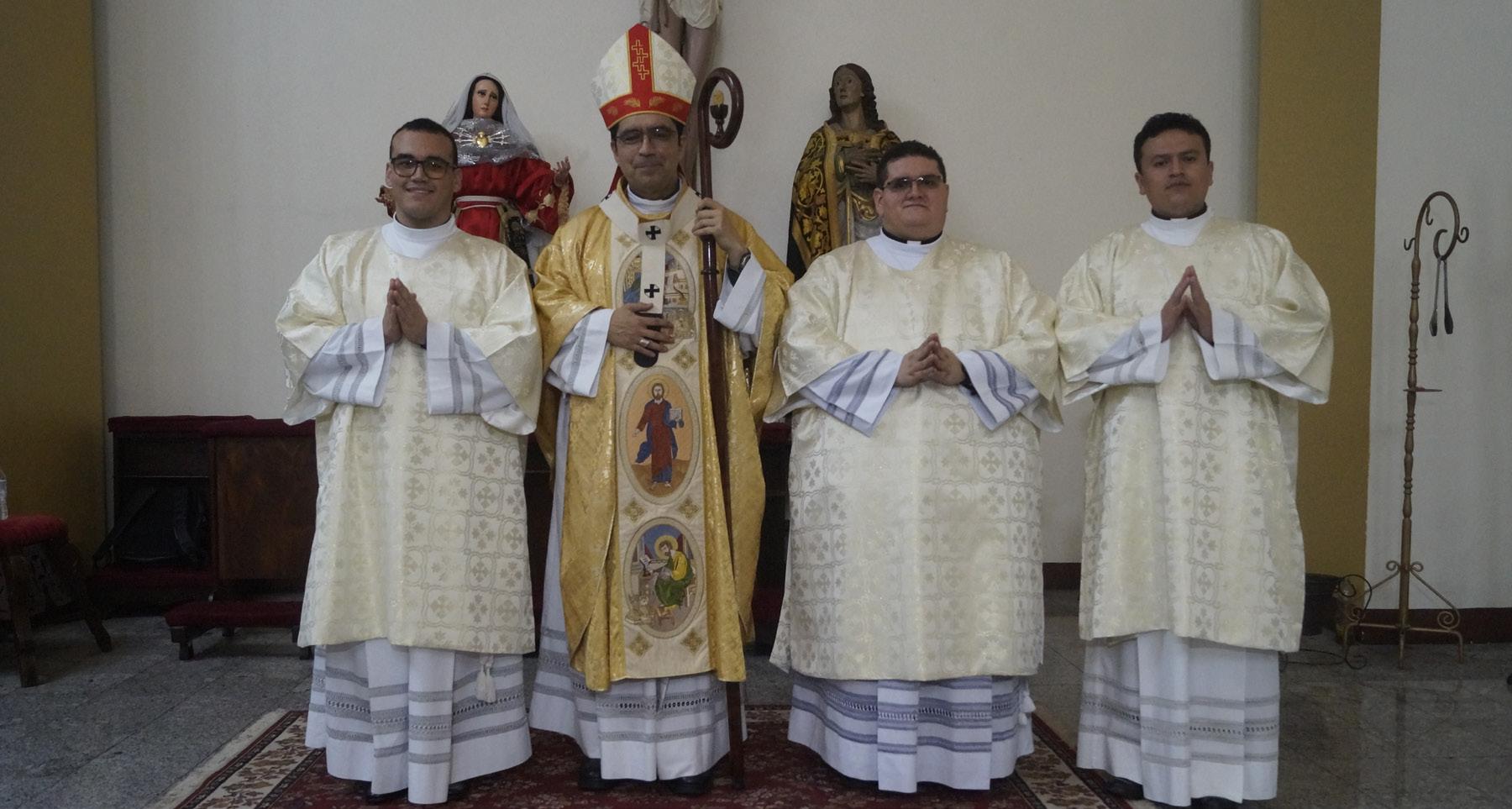 De Izquierda a Derecha: Diacono Diego José Márquez Rodenas, Monseñor José Luis Escobar Alas, Arzobispo de San Salvador; Diacono Walter Alfonso Siguenza Retana y Diacono Oscar Josécarlos López González