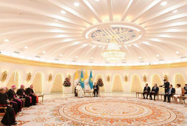 El Palacio “Ak Orda”, inaugurado oficialmente el 24 de diciembre de 2004, surge en la orilla izquierda del rio Ishim, y fue construido con el objetivo de simbolizar el poder y el dinamismo de un país en rápido crecimiento. Además, es el mayor complejo arquitectónico de la ciudad, realizado con las más modernas técnicas de construcción. Este enorme complejo arquitectónico fue el marco en el cual se desarrolló la Visita de cortesía del Pontífice al Presidente de la Republica. Tras la foto oficial de las delegaciones, el Santo Padre y el Presidente se reunieron de forma privada en la East Hall del Palacio presidencial. Al final del encuentro, el Señor Kasim-Yomart K. Tokaev y el Santo Padre se dirigieron a la “Sala de Conciertos Qazaq” para el Encuentro con las Autoridades, la sociedad civil y el Cuerpo Diplomático.