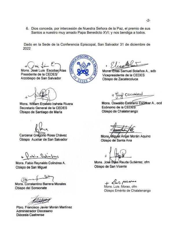 3. Los Obispos de la Conferencia Episcopal de El Salvador, en unidad con el Clero, de nuestra Provincia Eclesiástica, compartimos en estos momentos el dolor de toda la Iglesia por la muerte de Su Santidad , el Papa Benedicto XVI. Junto al dolor, nos invade también un sentimiento de enorme agradecimiento por la vida y el legado de un pontífice que nos ayudó a permanecer arraigados en la fe, gozando y transmitiendo la alegría de ser cristianos en el mundo. No podemos sino dar gracias a Dios por un Papa que nos edificó siempre con su ejemplo de libertad, humildad, su amor a la verdad y su gran confianza en Dios.