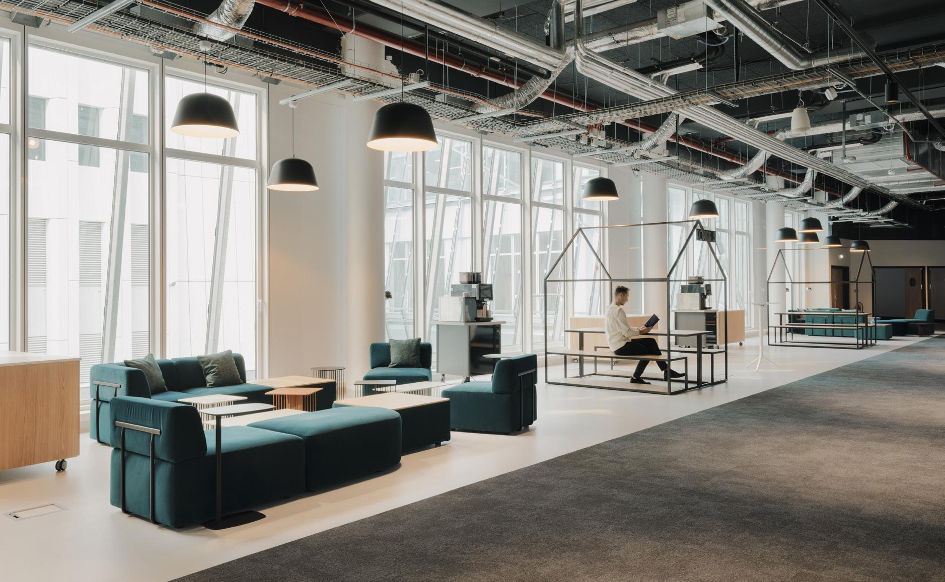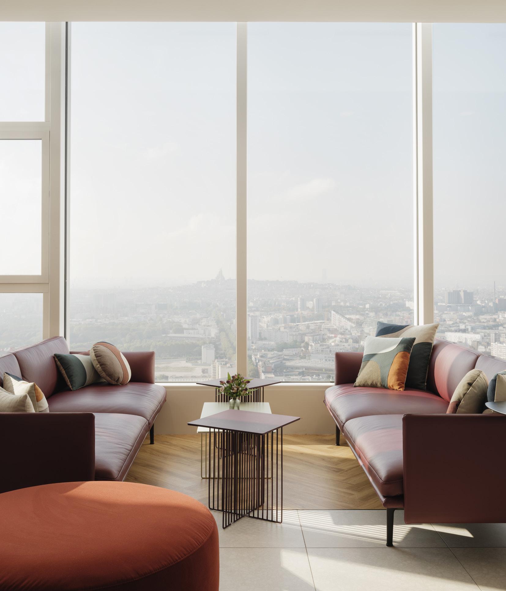 Différents espaces ont été aménagés : une zone de détente et un espace de travail, comprenant des tables hautes, une estrade et des pupitres, offrant une vue imprenable sur la skyline. La délimitation de ces divers espaces par des revêtements mur / sol différents, apporte une touche sophistiquée et singulière au lieu.