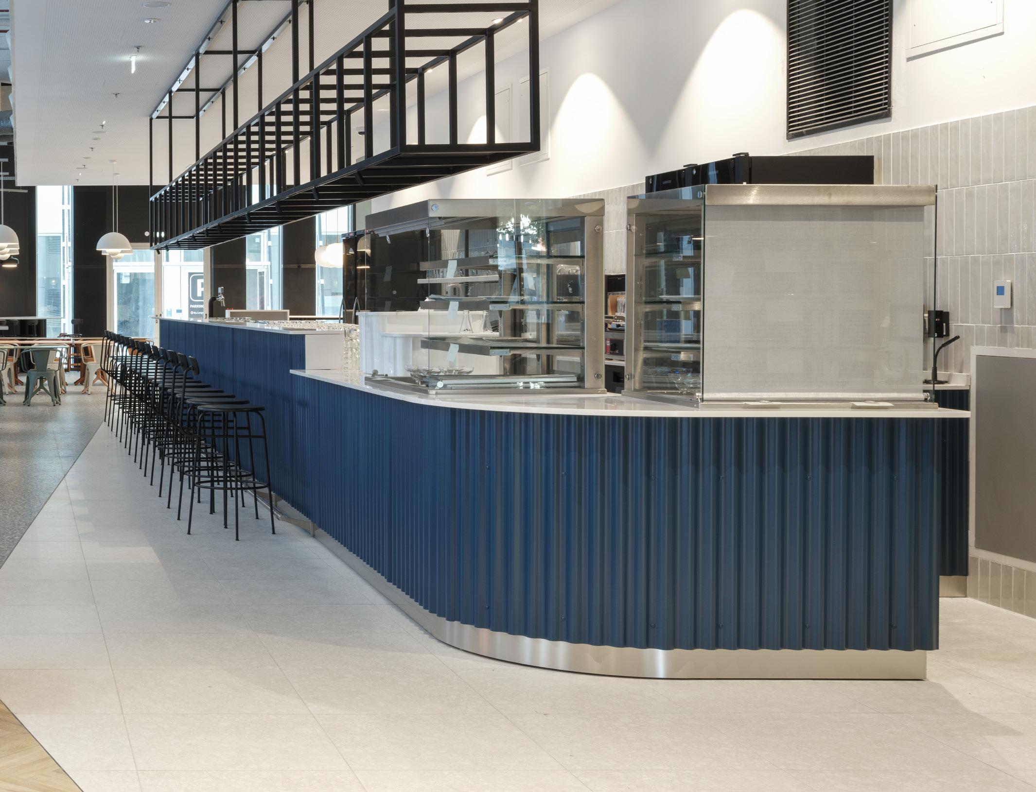 Dans ces espaces, le design concept allie le style industriel aux brasseries parisiennes : les banquettes colorées et les assises en bois viennent révéler les matériaux bruts et texturés comme les buffets avec leur structure en acier noir ou encore le bar en tôle ondulée.