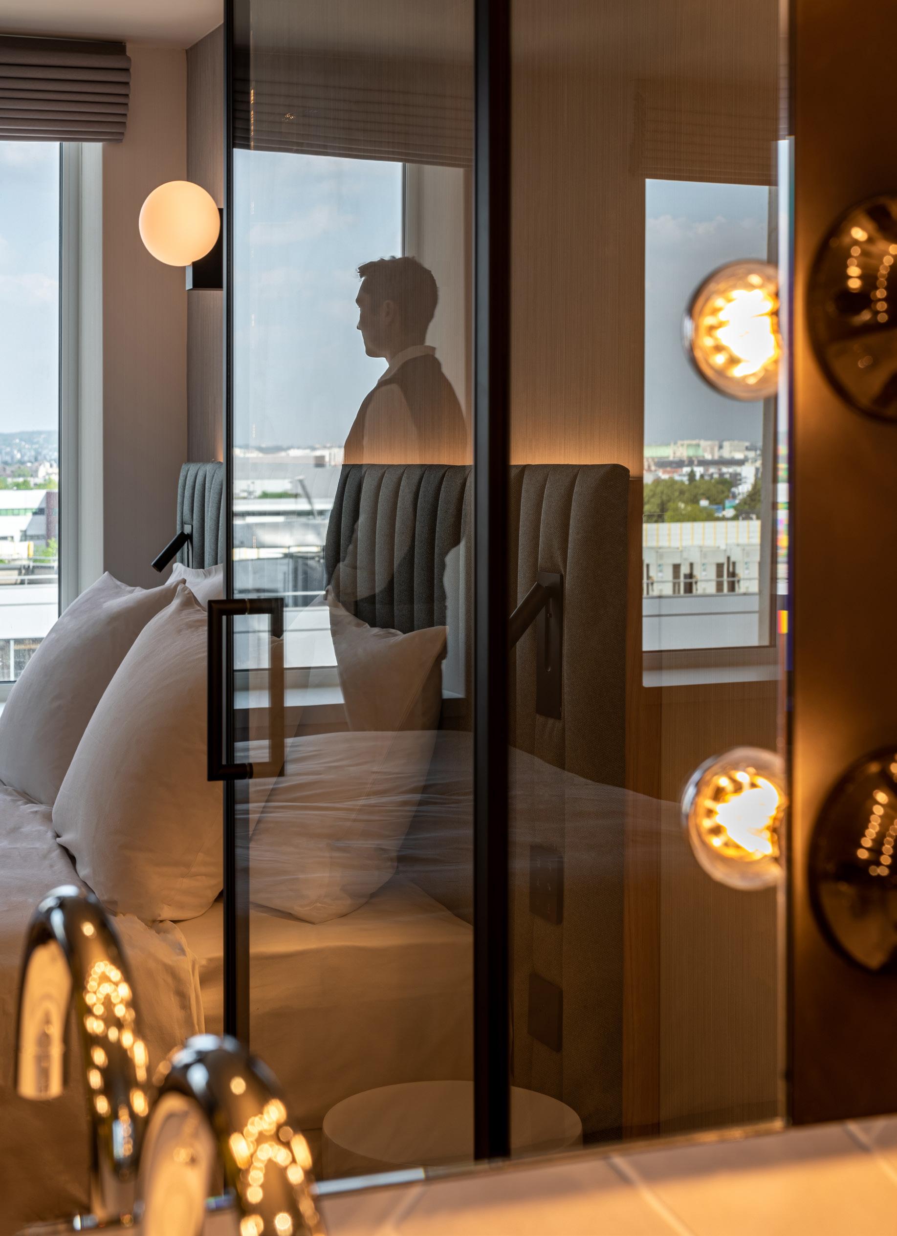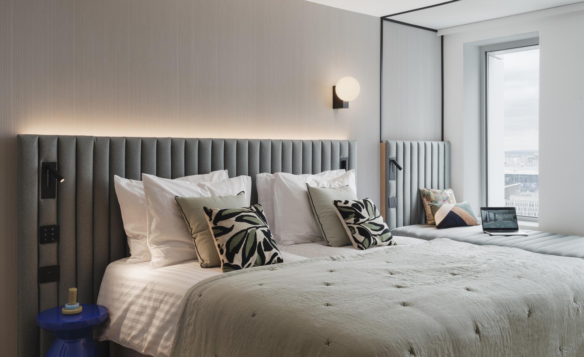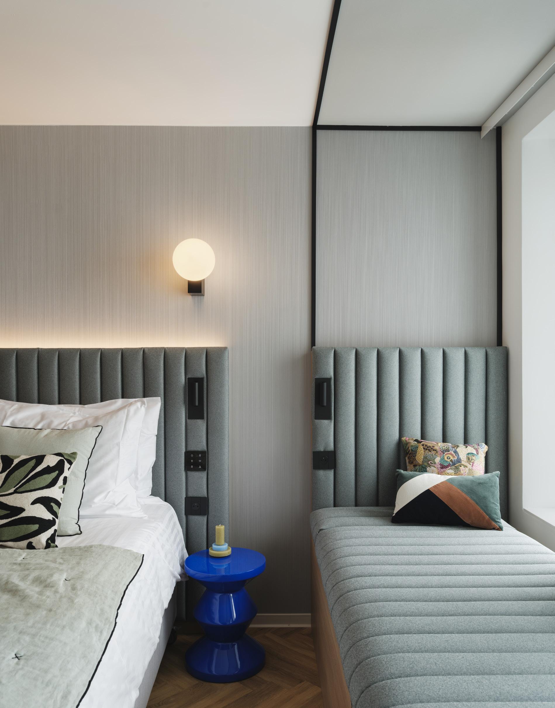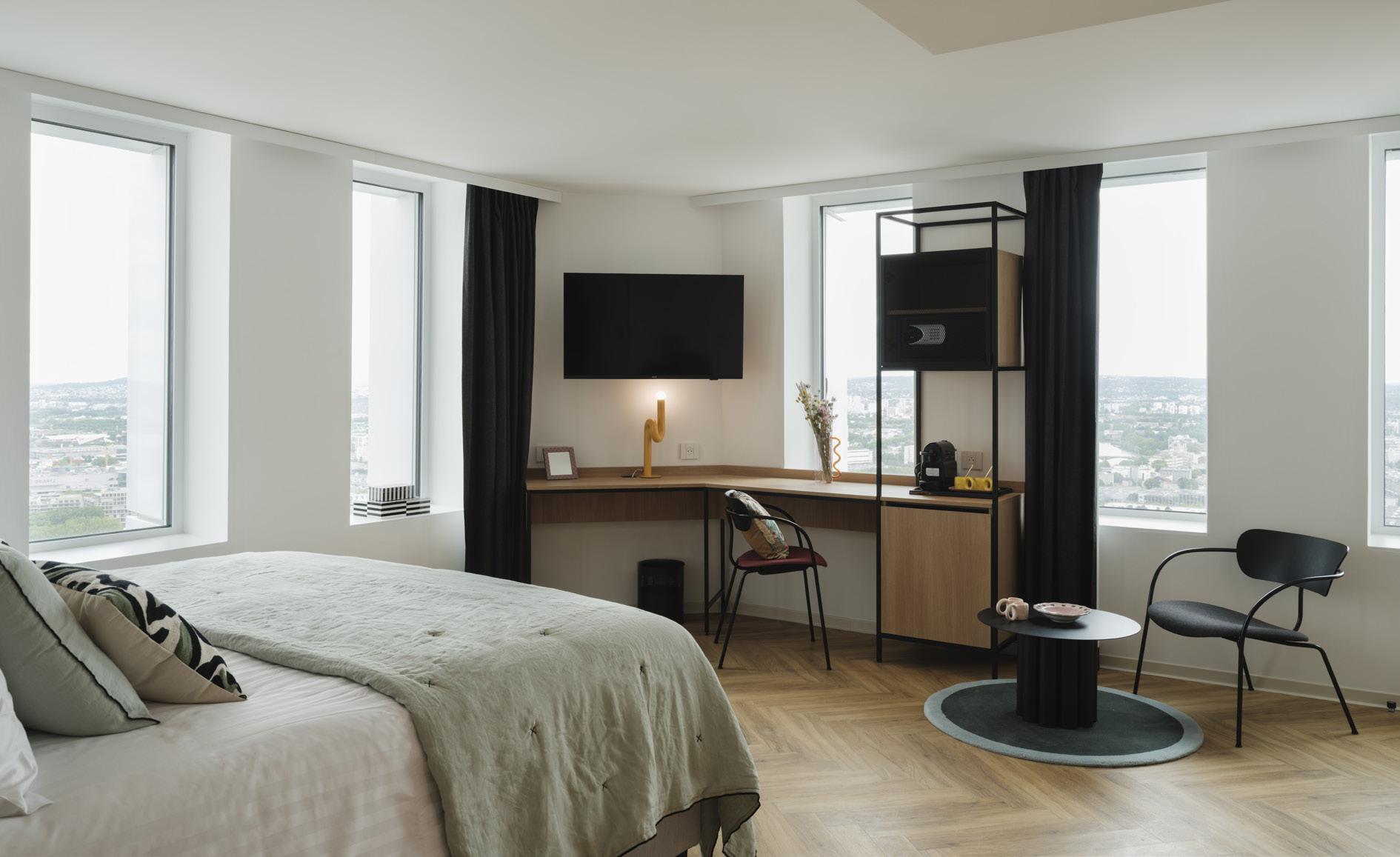 Pour répondre aux contraintes structurelles de la tour, qui s’amincit à mesure que l’on monte dans les étages, près de 40 typologies de chambres ont été conçues. Chaque chambre a été dessinée en fonction de sa typologie spécifique, et dans certains cas, les têtes de lit ont été mutualisées pour intégrer la technique. Le mobilier a été crée sur mesure, avec des modules adaptés aux différentes tailles de chambres, qu’elles soient petites ou grandes.