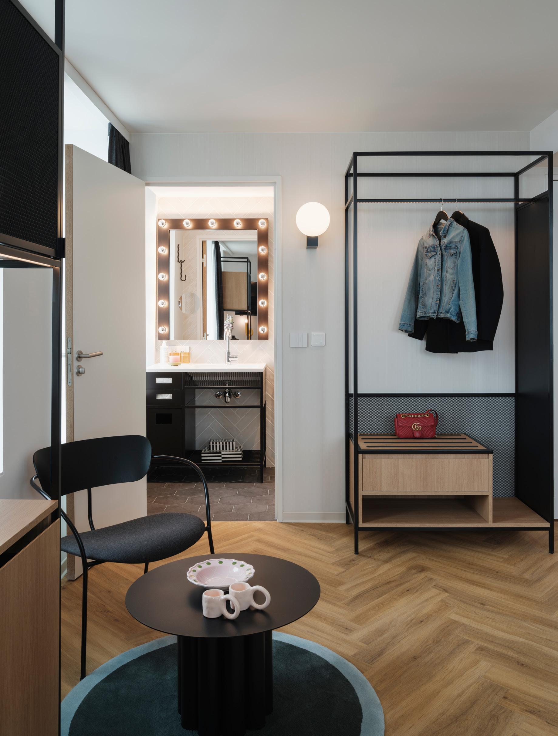 As in the common areas, the concept guiding the room layout blends three styles: industrial, classic, and urban.