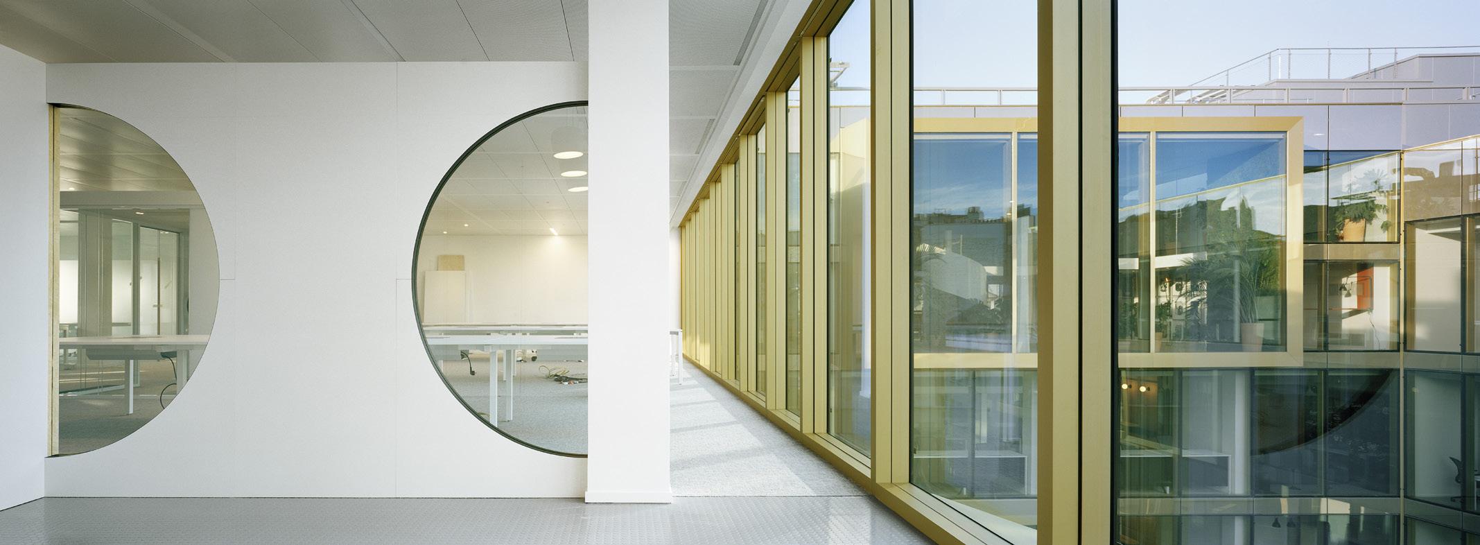 Le hall d’accueil, accessible par la rue des Jeûneurs, facilite les déplacements dans les étages grâce à deux noyaux verticaux.