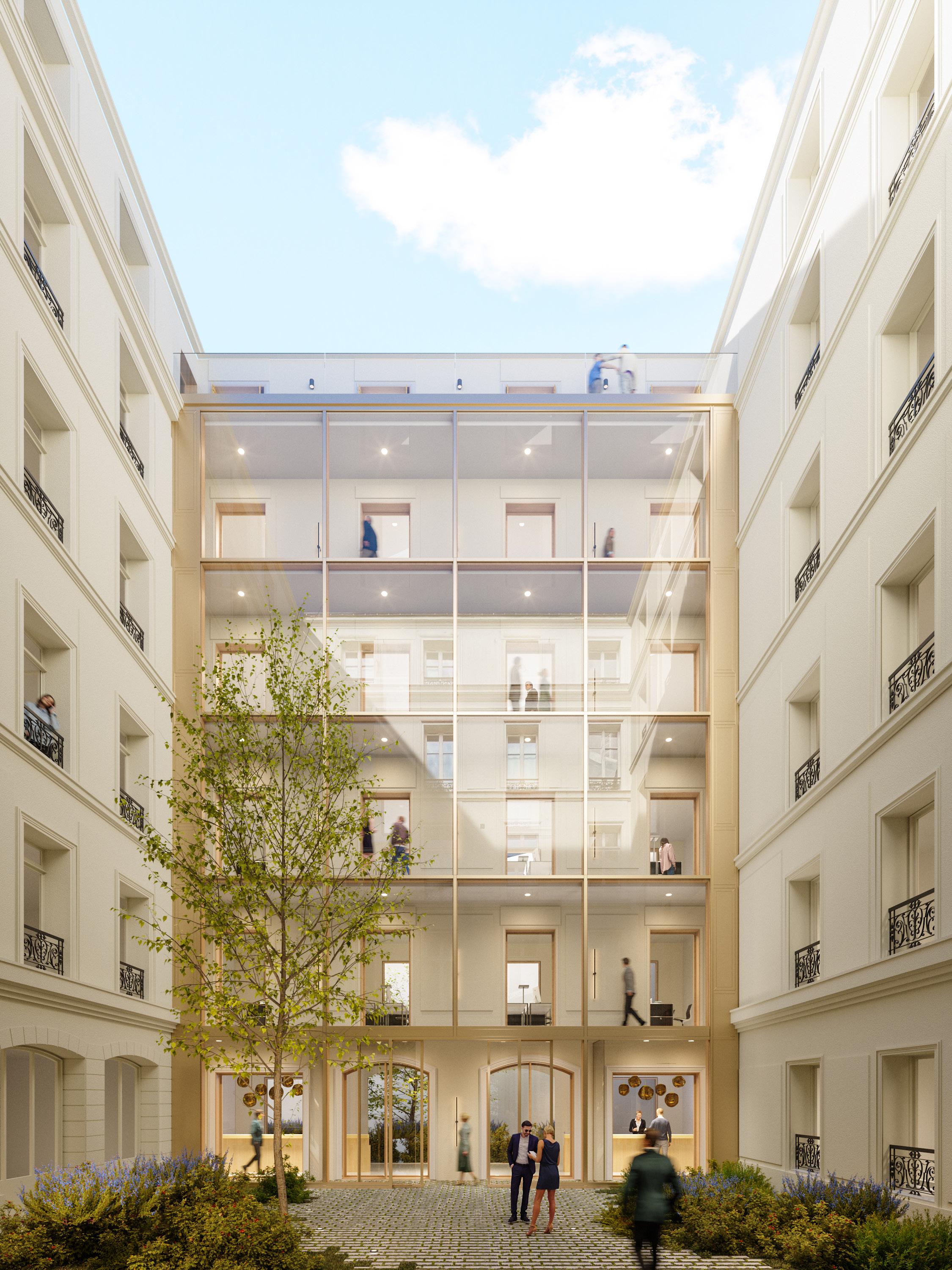 Le projet consiste d’une part à valoriser les atouts de l’existant et d’autre part à repenser l’immeuble de manière à le rendre contemporain et fonctionnel. Notre travail est de sublimer l’ensemble du bâtiment tout en conservant ses éléments historiques. Il dispose d’une façade haussmannienne chic et élégante, qui a retrouvé sa splendeur grâce à un ravalement complet. La restructuration se veut discrète à l’extérieur côté rue, où entre rigueur et élégance, l’esprit haussmannien est parfaitement préservé. Spectaculaire à l’intérieur, les volumes ont été entièrement reconfigurés, changeant ainsi la vision de l’espace. Les accès et les circulations sont plus fluides et le choix de matériaux et de luminaires raffinés vient affirmer une personnalité remarquable et séduisante au bâtiment. Le rez-dechaussée est repensé intégralement. L’entrée principale se fait au n° 122, marquée par une grande porte qui ouvre sur une cours végétalisée et une imposante façade tout en transparence faisant la liaison entre les bâtiments appelée la double peau.