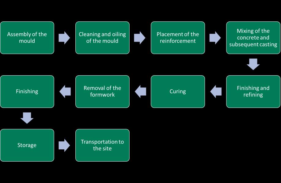 The prefabricated filigree concrete slab manufacturing begins with the preparation of the mould. This includes assembly of the mould depending on the element dimensions, cleaning of the mould and application of the form oil. The reinforcement and steel details are then put in place according to the technical element drawing. Wet concrete is then poured into the mould and vibrated into place, and surface finished. After casting, the slab is covered and cured. After curing the slab is then demoulded and moved out of the factory. Eventually, it is transported to the construction site.