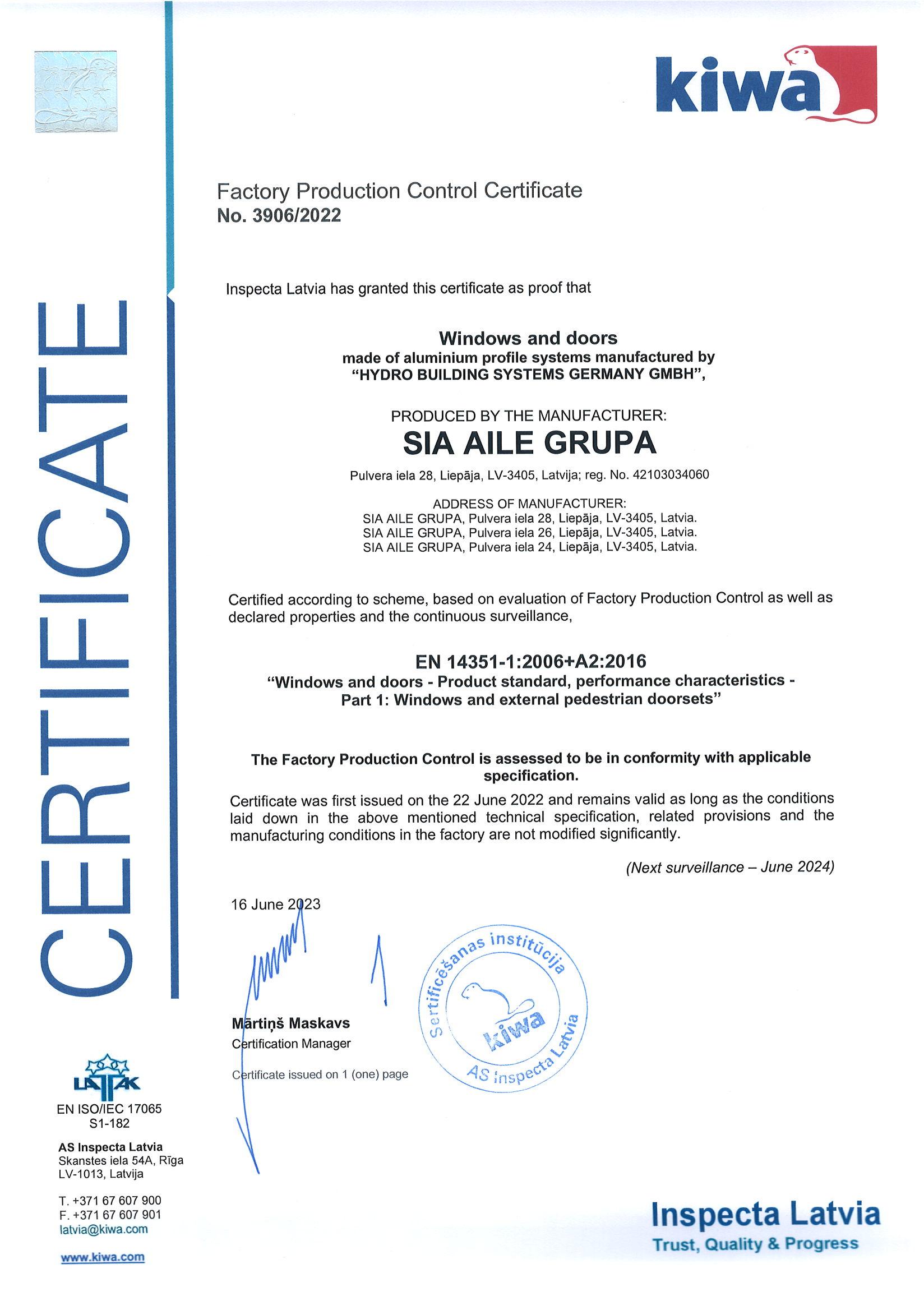 Inspecta Nr. 3906/2022, Hydro Building Systems Germany windows and doors