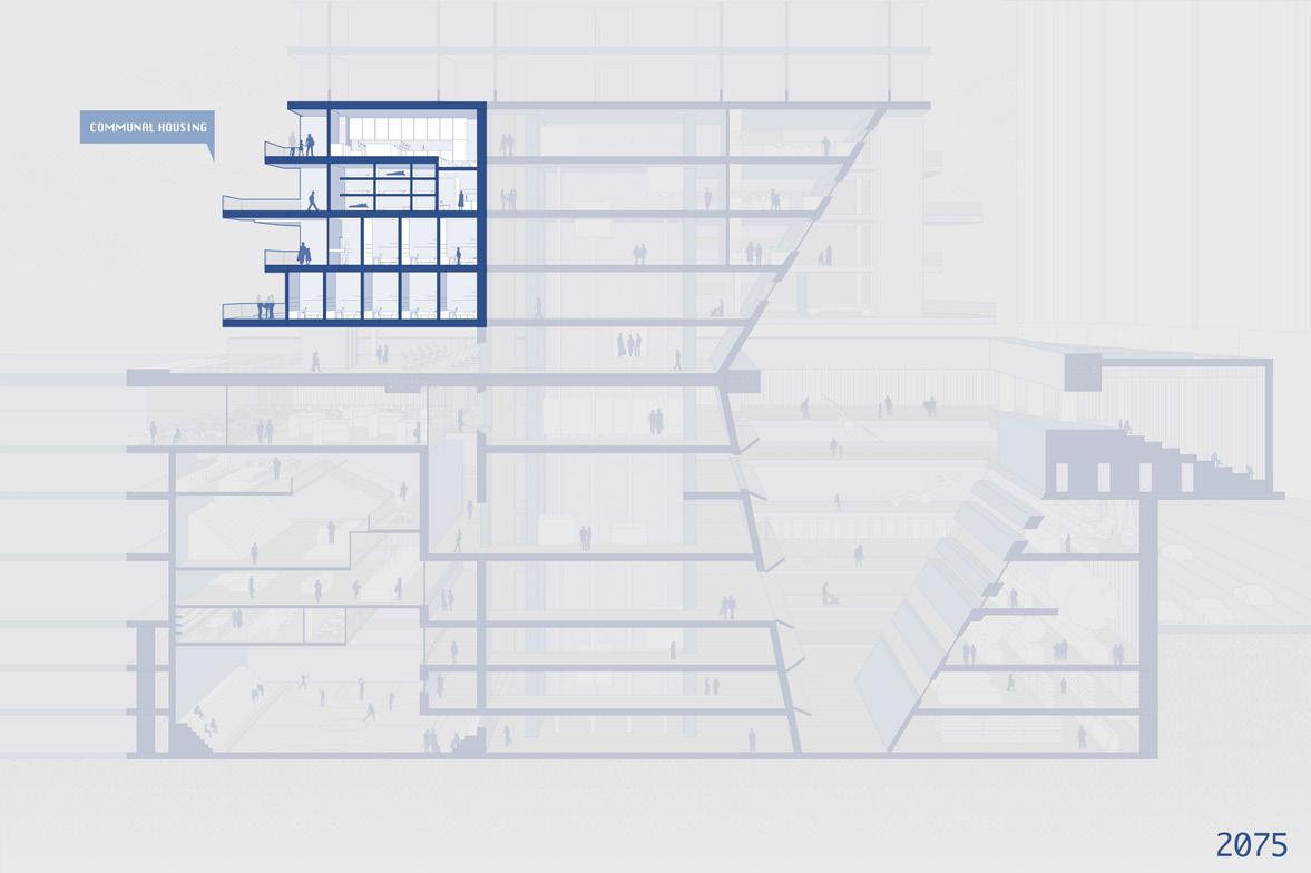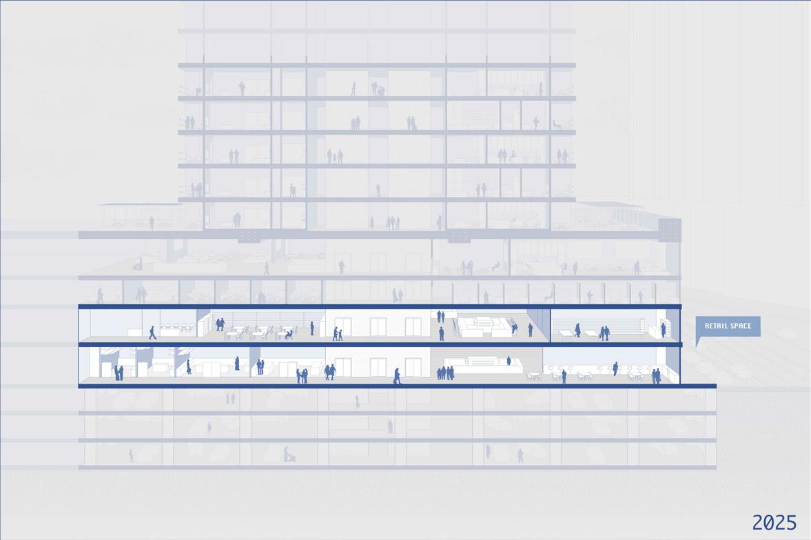 Architecture is a dynamic process shaped by continuous change rather than a static product. Designing with planned incompleteness and flexibility enables buildings to evolve alongside the people who use them, without imposing a fixed outcome. This approach anticipates future needs, empowering surrounding communities and advancing technologies to shape spatial experiences over time. This timeline transformation focuses on the Oceanwide Plaza towers in downtown Los Angeles, also known as the “graffiti towers,” through three 25-year phases. Beginning in 2025, the first phase centers on immediate activation. By 2050, the focus shifts to adapting the building to evolving climate conditions. In 2075, the approach emphasizes integration of technological advancements that will inevitably reshape architectural systems and technologies. As this continual transformation of Oceanside Plaza unfolds, the passage of time becomes embedded in its materiality, serving as a visible record of its evolving nature.