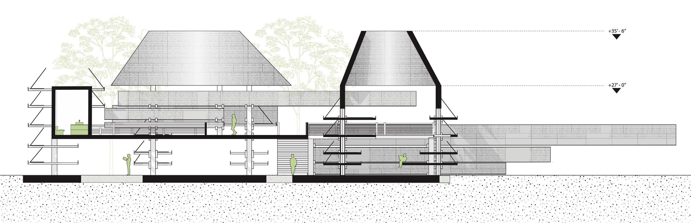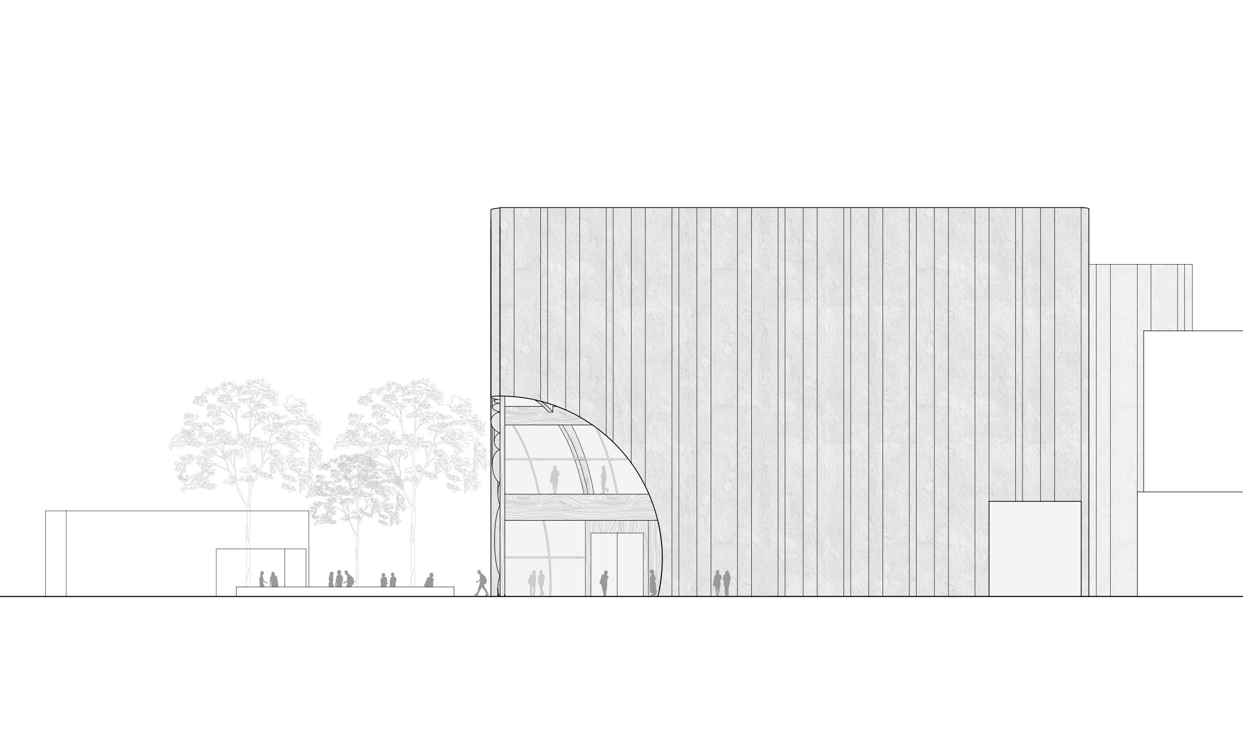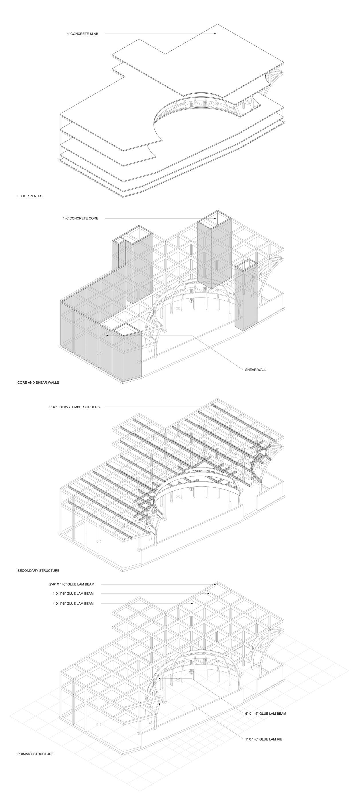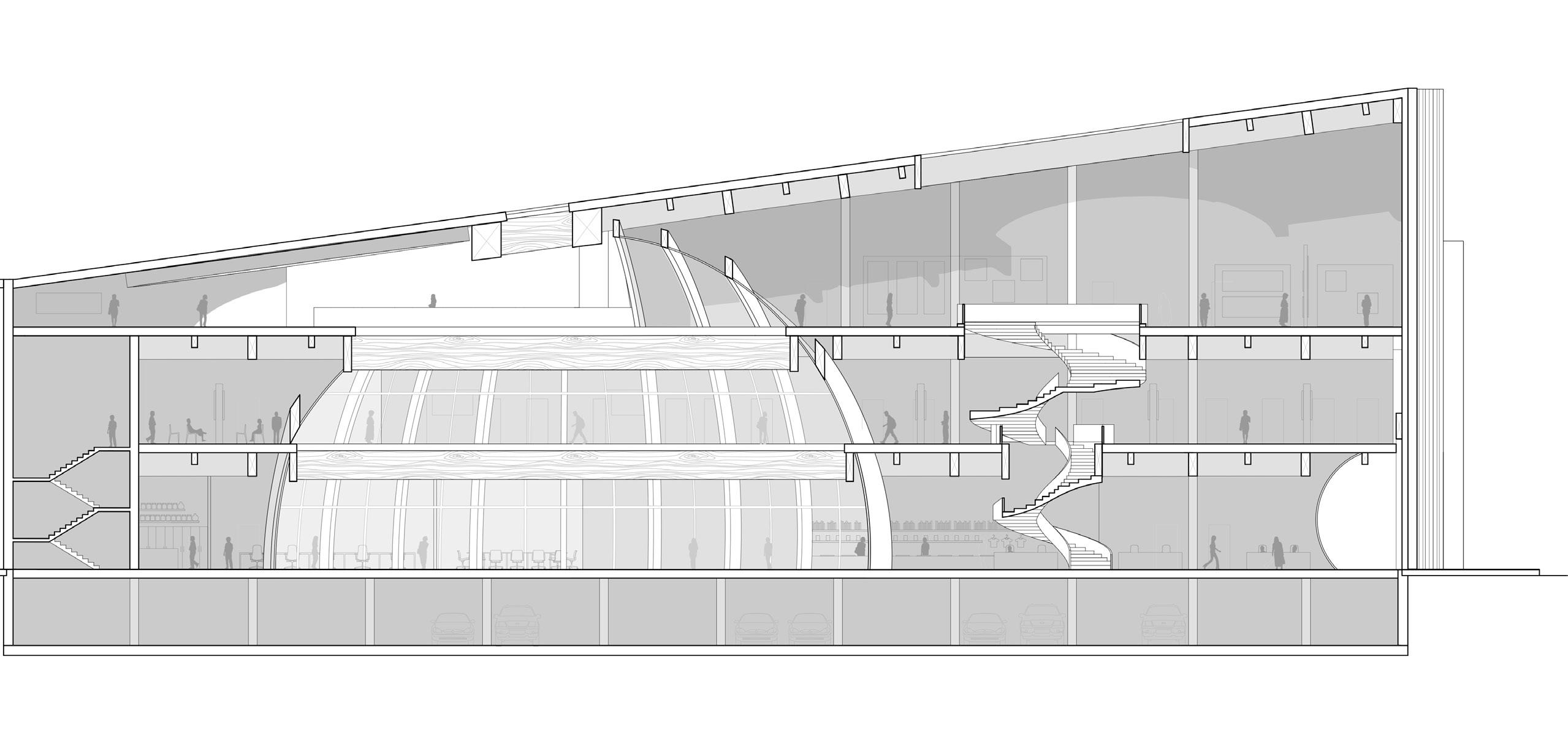 This project emphasizes the interactions between people and space by manipulating the proximity of physical and visual interactions. By incorporating glass to redefine the boundaries between public and private areas, the museum creates a space for the community, tourists, and individuals passing through to utilize. The plaza serves as an extension of the museum, both contributing to the urban fabric of downtown Los Angeles. This CLT wood structure features screening rooms, a MOMA exhibit, and dedicated art and film storage, all enveloped in a scalloped concrete facade. The facade design, combined with the strategically placed skylight openings, enables the domes to selectively filter light, creating a distinctive atmosphere for the film museum.