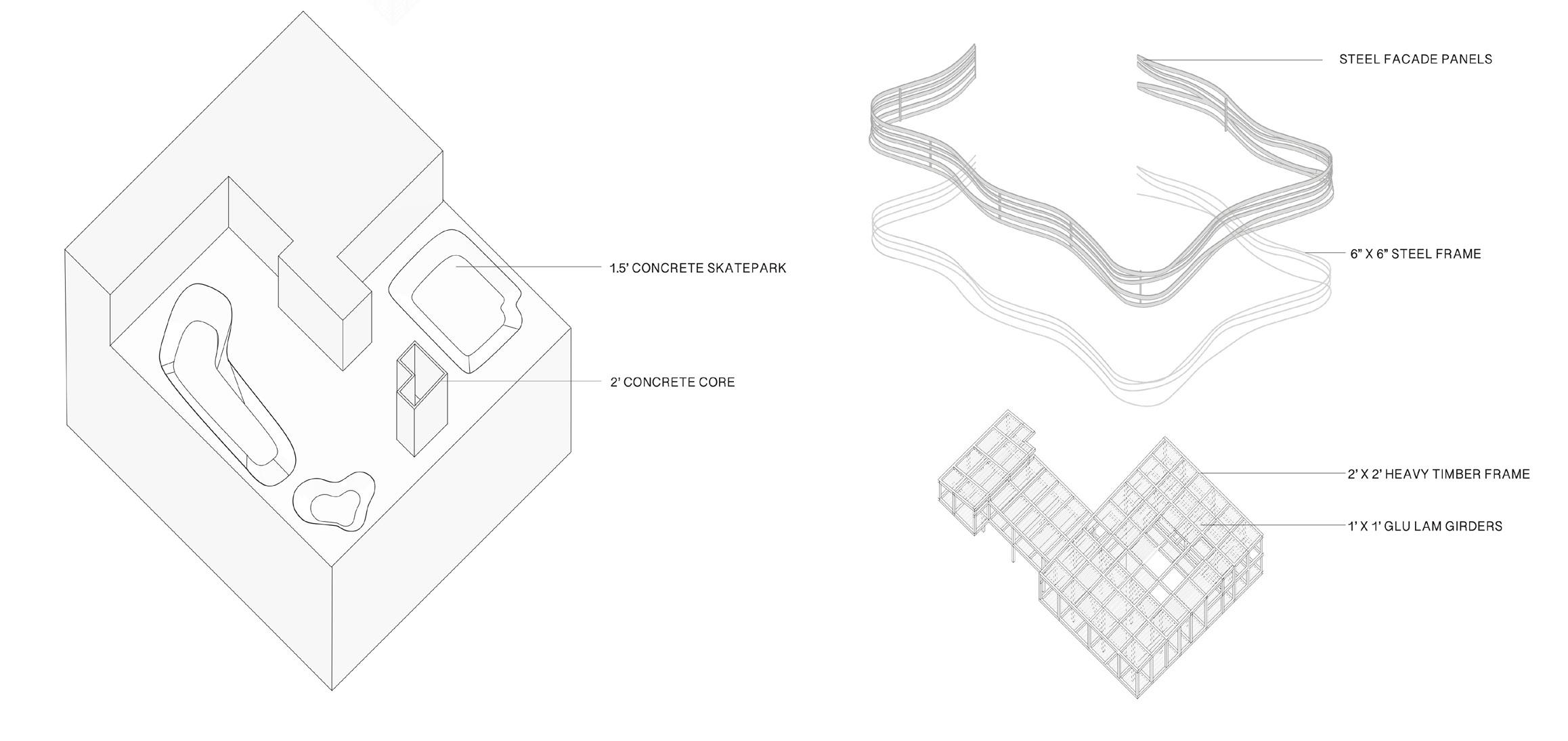 This studio reimagined the Broadway Trade Center in Downtown Los Angeles, a historic Beaux-Arts landmark that has remained inactive for over a decade. Extensive site research and community engagement revealed a need for dedicated skate spaces in Downtown LA—ones that wouldn’t disrupt businesses, traffic, or residents. DTLA Skate was envisioned as the city’s first downtown skatepark, transforming the building into a dynamic, multipurpose hub that seamlessly integrates skating with an event hall, restaurant, and community gathering spaces. Designed to cater to both skaters and the wider public, the project capitalizes on breathtaking city views, establishing a space for recreation, social interaction, and cultural events.