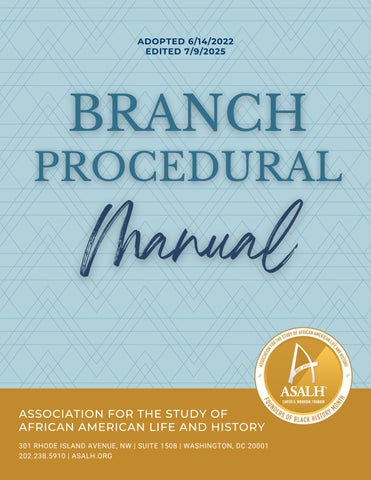 The Association for the Study of African American Life and History, Inc (ASALH) is providing this Branch Procedural Manual to establish a common base of understanding on the purpose, creation, and functioning of a branch The Manual is intended to provide members with the information needed to start and operate a successful branch