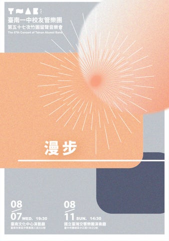 這次音樂會的主題 《漫步__ 》, 希望大家能夠隨著樂曲 ,漫步在羅馬的街道 , 漫步在布滿櫻花的樹下。又或是走入回憶,漫步在當年的校園生活,漫步在自己獨一 無二的故事。今晚,感謝大家的蒞臨,請以最舒服的狀態,享受由臺南一中校友管樂 團所帶來的樂曲,盡情隨著樂曲的流動,漫步在這樂海之中。