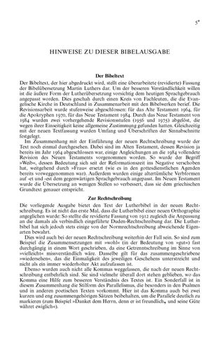 Der Bibeltext Der Bibeltext, der hier abgedruckt wird, stellt eine überarbeitete (revidierte) Fassung der Bibelübersetzung Martin Luthers dar. Um der besseren Verständlichkeit willen ist die äußere Form der Lutherübersetzung vorsichtig dem heutigen Sprachgebrauch angepasst worden. Dies geschah durch einen Kreis von Fachleuten, die die Evangelische Kirche in Deutschland in Zusammenarbeit mit den Bibelwerken berief. Die Revisionsarbeit wurde stufenweise abgeschlossen: für das Alte Testament 1964, für die Apokryphen 1970, für das Neue Testament 1984. Durch das Neue Testament von 1984 wurden zwei vorhergehende Revisionsstufen (1956 und 1975) abgelöst, die wegen ihrer Einseitigkeit keine allgemeine Zustimmung gefunden hatten. Gleichzeitig mit der neuen Textfassung wurden Umfang und Überschriften der Sinnabschnitte festgelegt. Im Zusammenhang mit der Einführung der neuen Rechtschreibung wurde der Text noch einmal durchgesehen. Dabei sind im Alten Testament, dessen Revision ja bereits im Jahr 1964 abgeschlossen war, einige Angleichungen an die 1984 vollendete Revision des Neuen Testaments vorgenommen worden. So wurde der Begriff »Weib«, dessen Bedeutung sich seit der Reformationszeit ins Negative verschoben hat, weitgehend durch »Frau« ersetzt (wie es in den gottesdienstlichen Agenden bereits vorweggenommen war). Außerdem wurden einige altertümliche Verbformen auf -et und -est dem gegenwärtigen Sprachgebrauch angepasst. Im Neuen Testament wurde die Übersetzung an wenigen Stellen so verbessert, dass sie dem griechischen Grundtext genauer entspricht. Zur Rechtschreibung Die vorliegende Ausgabe bietet den Text der Lutherbibel in der neuen Rechtschreibung. Es ist nicht das erste Mal, dass die Lutherbibel einer neuen Orthographie angeglichen wurde: So stellte die revidierte Fassung von 1912 zugleich die Anpassung an die damals als verbindlich eingeführte Duden-Rechtschreibung dar. Die Lutherbibel hat sich jedoch stets einige von der Normrechtschreibung abweichende Eigenarten bewahrt. Dies wird auch bei der neuen Rechtschreibung weiterhin der Fall sein. So sind zum Beispiel die Zusammensetzungen mit »wohl« (in der Bedeutung von »gut«) fast durchgängig in einem Wort geschrieben, da eine Getrenntschreibung im Sinne von »vielleicht« missverständlich wäre. Dasselbe gilt für das zusammengeschriebene »wiedersehen«, das die Einmaligkeit des jeweiligen Geschehens unterstreicht und nicht als ein immer wiederholter Akt aufzufassen ist. Ebenso wurden auch nicht alle Kommas weggelassen, die nach der neuen Rechtschreibung entbehrlich sind. Sie sind vielmehr überall dort stehen geblieben, wo das Komma eine Hilfe zum besseren Verständnis des Textes ist. Ein Sonderfall ist in diesem Zusammenhang die Stilform des Parallelismus, die besonders in den Psalmen und in anderen poetischen Texten vorkommt. Hier ist das Komma auch bei zwei kurzen und eng zusammengehörigen Sätzen beibehalten, um die Parallele deutlich zu markieren (zum Beispiel »Danket dem Herrn, denn er ist freundlich, und seine Güte währet ewiglich«).