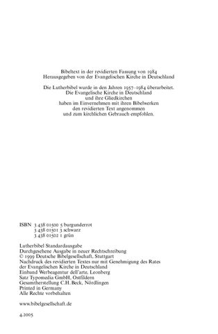 ISBN 3 438 01500 5 burgunderrot 3 438 01501 3 schwarz 3 438 01502 1 grün Lutherbibel Standardausgabe Durchgesehene Ausgabe in neuer Rechtschreibung © 1999 Deutsche Bibelgesellschaft, Stuttgart Nachdruck des revidierten Textes nur mit Genehmigung des Rates der Evangelischen Kirche in Deutschland Einband Werbeagentur dell’arte, Leonberg Satz Typomedia GmbH, Ostfildern Gesamtherstellung C.H. Beck, Nördlingen Printed in Germany Alle Rechte vorbehalten www.bibelgesellschaft.de 4.2005