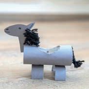 ESEL: Damit auf dem Esel jemand reiten kann, wird ein Loch in den Rücken geschnitten. Bitte unbedingt prüfen, ob die Person gut hinein passt. Danach den Esel mit grauem Papier bekleben. Bei dem Loch am Rücken das Papier sternförmig einschneiden und nach innen kleben.
