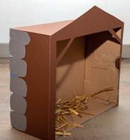 KRIPPE: Eine Klorolle einmal längs und einmal quer halbieren. Die Stücke wie auf dem Bild zuschneiden und zusammenkleben.