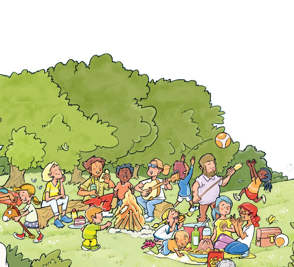 Bestimmt habt ihr schon beim Essen viel erzählt! Damit jede und jeder jetzt noch einmal in Ruhe zu Wort kommt, haben wir uns Check-in-Fragen überlegt. Das Wimmelbild, das ihr hier im Buch findet, unterstützt euch darin, ins Gespräch zu kommen. Wer nicht erzählen will, mag oder kann, der muss nicht. Das gilt übrigens immer!