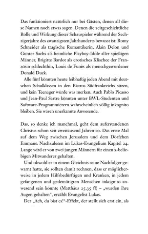 Das funktioniert natürlich nur bei Gästen, denen all diese Namen noch etwas sagen. Denen die zeitgeschichtliche Rolle und Wirkung dieser Schauspieler während der Sechzigerjahre des zwanzigsten Jahrhunderts bewusst ist: Romy Schneider als tragische Romantikerin, Alain Delon und Gunter Sachs als heimliche Playboy-Idole aller spießigen Männer, Brigitte Bardot als erotisches Klischee der Französin schlechthin, Louis de Funès als menschgewordener Donald Duck. Alle fünf könnten heute leibhaftig jeden Abend mit deutschen Schulklassen in den Bistros Südfrankreichs sitzen, und kein Teenager würde was merken. Auch P ablo Picasso und Jean-Paul Sartre könnten unter BWL-Studenten und Software-Programmierern wahrscheinlich völlig inkognito bleiben. Sie wären unerkannte Anwesende. Das, so denke ich manchmal, geht dem auferstandenen Christus schon seit zweitausend Jahren so. Das erste Mal auf dem Weg zwischen Jerusalem und dem Dörfchen Emmaus. Nachzulesen im Lukas-Evangelium Kapitel 24. Lange wird er von zwei jungen Männern für einen x-beliebigen Mitwanderer gehalten. Und obwohl er in einem Gleichnis seine Nachfolger gewarnt hatte, sie sollten damit rechnen, dass er möglicherweise in jedem Hilfsbedürftigen und Kranken, in jedem gefangenen und gedemütigten Menschen inkognito an wesend sein könnte (Matthäus 25,35 ff) – „wurden ihre Augen gehalten“, erzählt Evangelist Lukas. Der „Ach, du bist es!“-Effekt, der stellt sich erst ein, als