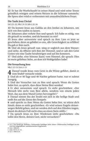 Darauf wurde Jesus vom Geist in die Wüste geführt, damit er vom Teufela versucht würde. 2 Und als er 40 Tage und 40 Nächte gefastet hatte, war er zuletzt hungrig. 3 Und der Versucher trat zu ihm und sprach: Wenn du Gottes Sohn bist, so sprich, dass diese Steine Brot werden! 4 Er aber antwortete und sprach: Es steht geschrieben: »Der Mensch lebt nicht vom Brot allein, sondern von einem jeden Wort, das aus dem Mund Gottes hervorgeht!«b 5 Darauf nimmt ihn der Teufel mit sich in die heilige Stadt und stellt ihn auf die Zinne des Tempels 6 und spricht zu ihm: Wenn du Gottes Sohn bist, so stürze dich hinab; denn es steht geschrieben: »Er wird seinen Engeln deinetwegen Befehl geben, und sie werden dich auf den Händen tragen, damit du deinen Fuß nicht etwa an einen Stein stößt«.c 7 Da sprach Jesus zu ihm: Wiederum steht geschrieben: »Du sollst den Herrn, deinen Gott, nicht versuchen!«d a (4,1) Der Teufel (gr. diabolos = Verleumder, Verkläger, hebr. Satan = Widersacher, Verkläger) ist ein von Gott abgefallenes, aufrührerisches Engelwesen. b (4,4) 5Mo 8,3. c (4,6) Ps 91,11-12. d (4,7) 5Mo 6,16.