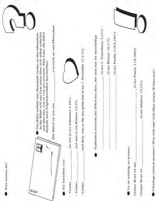 Der letzte Teil der Stunde sollte vor allem diesen Aspekt des „persönlichen Briefes“ betonen, dessen Inhalt Gottes Liebe zu uns und sein Plan mit uns ist. Die abschließende Frage des Arbeitsblattes kann man als vertiefenden Gesprächsimpuls nutzen (Hinweis u.a. auf die 10 Gebote usw.). Man kann das Gespräch darüber zusätzlich vertiefen, indem man weitere Fragen anschließt: „Hat Gott ein Recht auf uns?“, „Bin ich mit Gottes Willen einverstanden?“, „Wie kann man eigentlich nach dem Willen Gottes leben?“ usw. Beim Abschluss des Gesprächs möglichst wieder einen Bezug zum Thema „Bibel“ herstellen.
