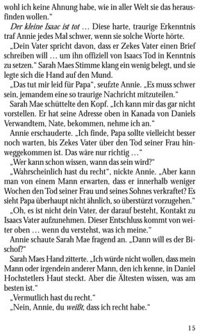 wohl ich keine Ahnung habe, wie in aller Welt sie das herausfinden wollen.“ Der kleine Isaac ist tot … Diese harte, traurige Erkenntnis traf Annie jedes Mal schwer, wenn sie solche Worte hörte. „Dein Vater spricht davon, dass er Zekes Vater einen Brief schreiben will … um ihn offiziell von Isaacs Tod in Kenntnis zu setzen.“ Sarah Maes Stimme klang ein wenig belegt, und sie legte sich die Hand auf den Mund. „Das tut mir leid für Papa“, seufzte Annie. „Es muss schwer sein, jemandem eine so traurige Nachricht mitzuteilen.“ Sarah Mae schüttelte den Kopf. „Ich kann mir das gar nicht vorstellen. Er hat seine Adresse oben in Kanada von Daniels Verwandtem, Nate, bekommen, nehme ich an.“ Annie erschauderte. „Ich finde, Papa sollte vielleicht besser noch warten, bis Zekes Vater über den Tod seiner Frau hinweggekommen ist. Das wäre nur richtig …“ „Wer kann schon wissen, wann das sein wird?“ „Wahrscheinlich hast du recht“, nickte Annie. „Aber kann man von einem Mann erwarten, dass er innerhalb weniger Wochen den Tod seiner Frau und seines Sohnes verkraftet? Es sieht Papa überhaupt nicht ähnlich, so überstürzt vorzugehen.“ „Oh, es ist nicht dein Vater, der darauf besteht, Kontakt zu Isaacs Vater aufzunehmen. Dieser Entschluss kommt von weiter oben … wenn du verstehst, was ich meine.“ Annie schaute Sarah Mae fragend an. „Dann will es der Bischof?“ Sarah Maes Hand zitterte. „Ich würde nicht wollen, dass mein Mann oder irgendein anderer Mann, den ich kenne, in Daniel Hochstetlers Haut steckt. Aber die Ältesten wissen, was am besten ist.“ „Vermutlich hast du recht.“ „Nein, Annie, du weißt, dass ich recht habe.“ 15