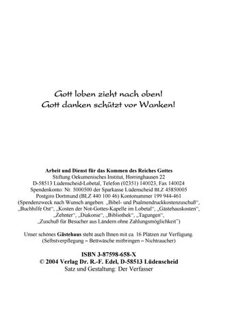 Arbeit und Dienst fĂŒr das Kommen des Reiches Gottes Stiftung Oekumenisches Institut, Horringhausen 22 D-58513 LĂŒdenscheid-Lobetal, Telefon (02351) 140023, Fax 140024 Spendenkonto: Nr. 5000500 der Sparkasse LĂŒdenscheid BLZ 45850005 Postgiro Dortmund (BLZ 440 100 46) Kontonummer 199 944-461 (Spendenzweck nach Wunsch angeben: âBibel- und PsalmendruckkostenzuschuĂâ, âBuchhilfe Ostâ, âKosten der Not-Gottes-Kapelle im Lobetalâ, âGĂ€stehauskostenâ, âZehnterâ, âDiakonieâ, âBibliothekâ, âTagungenâ, âZuschuĂ fĂŒr Besucher aus LĂ€ndern ohne Zahlungsmöglichkeitâ) Unser schönes GĂ€stehaus steht auch Ihnen mit ca. 16 PlĂ€tzen zur VerfĂŒgung. (Selbstverpflegung â BettwĂ€sche mitbringen â Nichtraucher)