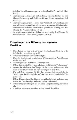 sönlichen Vorteil herausschlagen zu wollen (Joh 21,17; Hes 34,1; 1 Petr 5,1–5); • Verpflichtung, andere durch Einbeziehung, Training, Freiheit zur Entfaltung, Ermahnung und Erziehung für den Dienst auszurüsten (Mk 3,13–15); • Verpflichtung zu guter, bodenständiger Arbeit auf der Grundlage einer hohen Motivation, des Ernstnehmens von Verantwortlichkeiten, eines ausreichenden zeitlichen Einsatzes und gründlicher Planung und Ausführung des Programms (Esra 5,1–2); • ein verpflichteter, fröhlicher Geber, der regelmäßig den Zehnten für den Aufbau von Gottes Reich gibt (Mal 3,8–10).