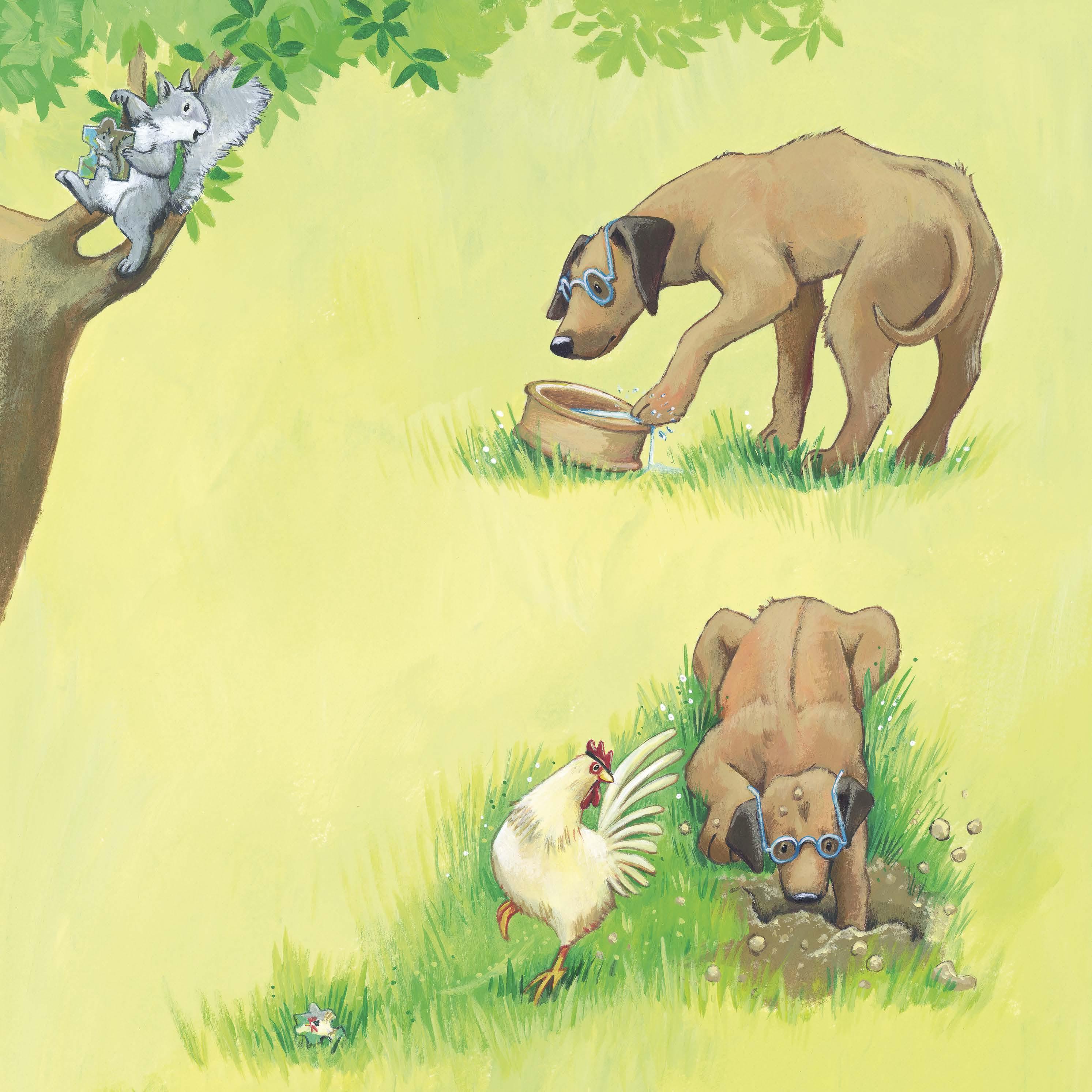 Er setzte die Brille auf und schnüffelte in seinem Futternapf. Aber da war kein Puzzleteil. Dann buddelte er im Garten herum. Nichts zu finden!