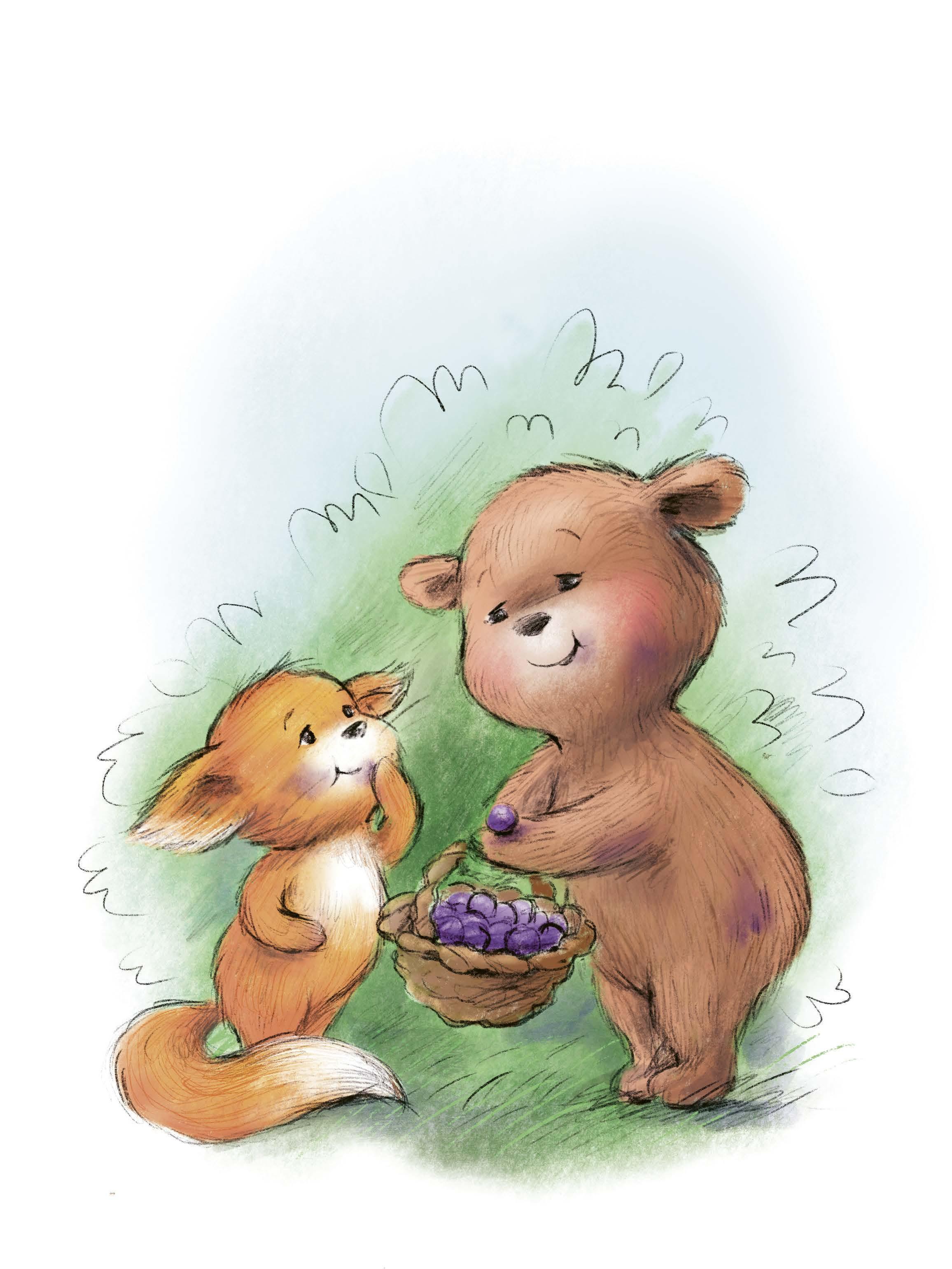 Der kleine Fuchs steckte eine Handvoll Beeren in seinen Mund . Der kleine Bär freute sich . Es ist schön, Sachen mit einem Freund zu teilen!