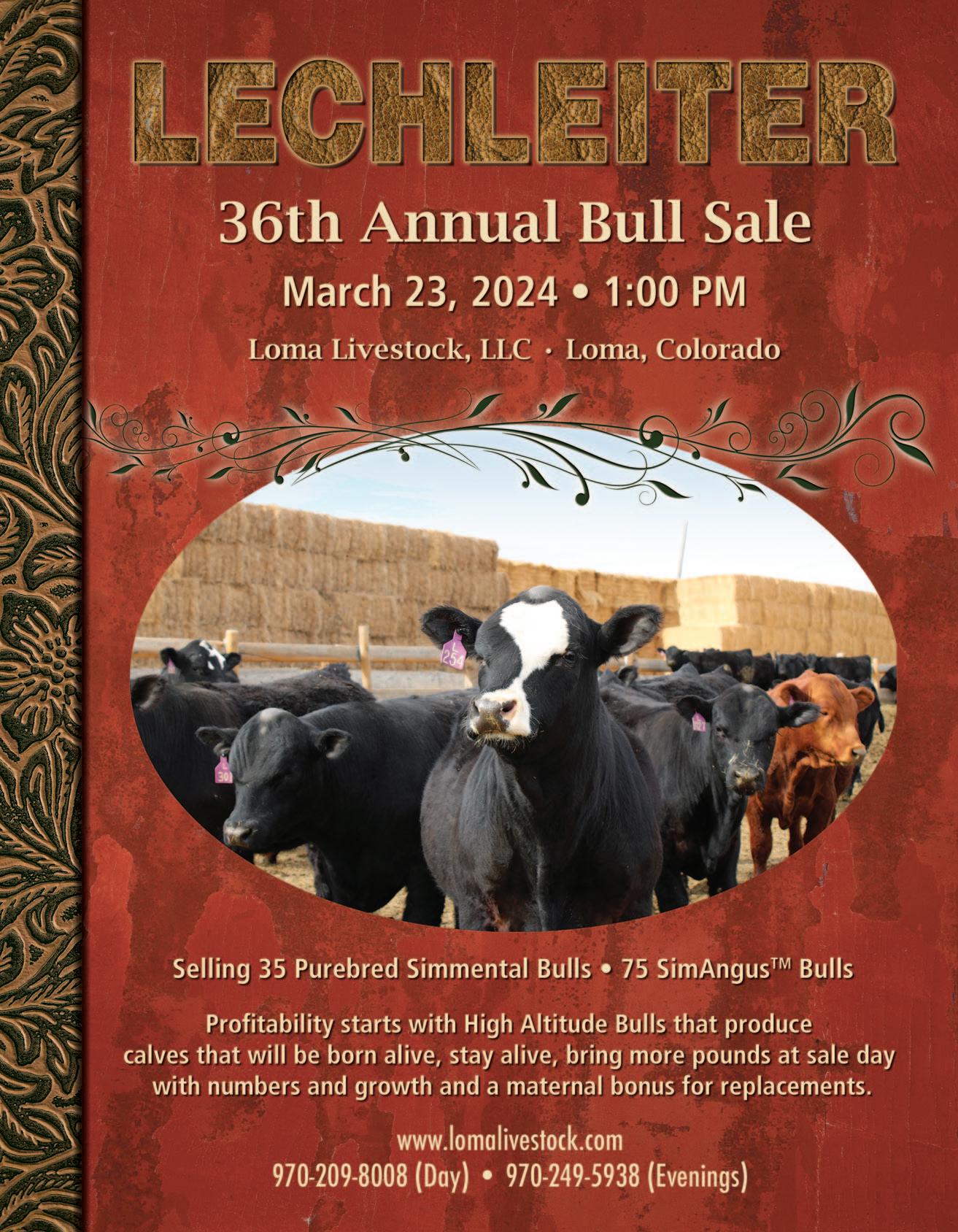 Welcome to the Lechleiter Simmental 36th Annual Simmental and SimAngus™ Bull Sale. The sale will be on Saturday, March 23, 2023 at 1:00 pm at Loma Livestock LLC, 1369 12 ½ Road, Loma, Colorado.