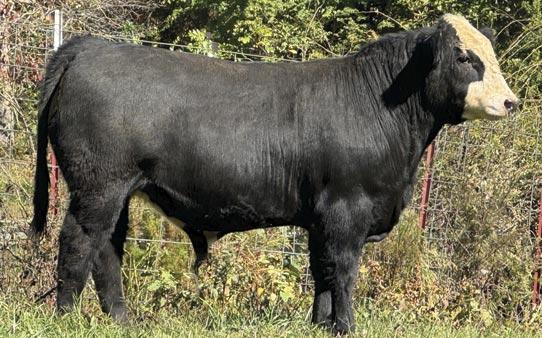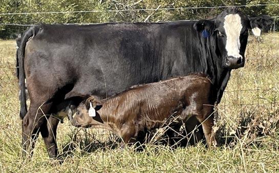 This blaze faced Homo. Black 3/4 blood cow always sticks on the first heat and raises a flashy calf. Her son was high seller for us last year. Sells with bull calf at side by THSF Lover Boy(ASA#2983443) born 9/20/24 Tattoo M74 with BW 82 lb.