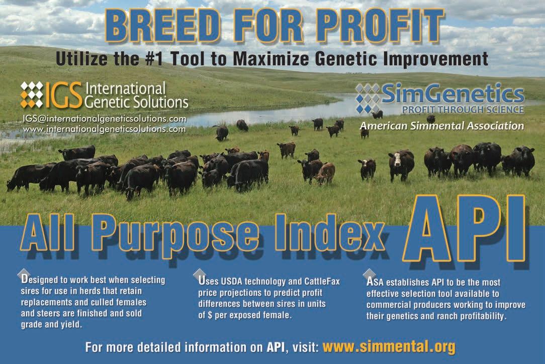 As genetic selection decisions that use tools to improve genetic merit are used, a compounding effect can be seen. One of the most effective tools available to make multi-trait improvement are economic selection indexes. For Simmental cattle two options are available: $API is an all-purpose index that covers traits across the beef supply chain, and $TI is a terminal index that looks at feedlot and carcass performance of progeny. These tools are excellent places to start because they weight an EPD profile based on its influence on profitability, and animals that rank high for the indexes will provide genetics that would improve many traits.
