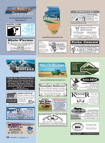 Prickly Pear Simmental Ranch Birthplace of the first Polled Black Simmental Bull Made in Montana Sale • February 6, 2016 Troy Wheeler, Cattle Manager: 406-949-1754 Don and Nancy Burnham • Gary Burnham 2515 Canyon Ferry Road • Helena, MT 59602 ASA No. 174 E-mail: burnhams@mt.net