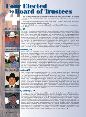 One incumbent and three newcomers have been elected to the ASA Board of Trustees. Incumbent Tim Smith, Giddings, Texas, was re-elected and will return for his second threeyear term. Newly elected board members are: Tim Curran, Ione, California; John Irvine, Manhattan, Kansas; and Clay Lassle, Glendive, Montana. All four individuals were sworn in and formally seated during ASA’s Annual Meeting, January 17, in Denver.