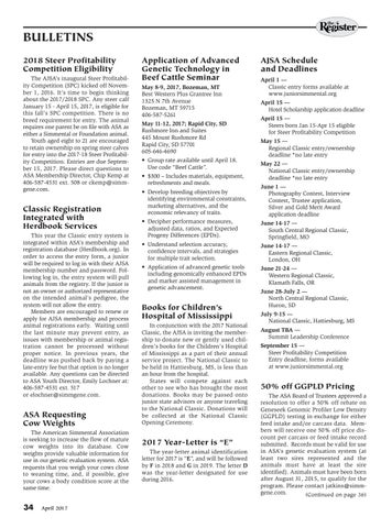 50% off GGPLD Pricing The ASA Board of Trustees approved a resolution to offer a 50% off rebate on Geneseek Genomic Profiler Low Density (GGPLD) testing in exchange for either feed intake and/or carcass data. Members will receive one 50% off price discount per carcass or feed intake record submitted. Records must be valid for use in ASA’s genetic evaluation system (at least two sires represented and the animals must have at least the sire identified). Animals must have been born after August 31, 2015, to qualify for the program. Please contact jatkins@simmgene.com. (Continued on page 36)