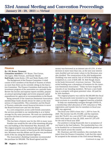 money was borrowed at an interest rate of 6.5%. A wise decision in more ways than one, as the next year interest rates doubled and real estate values in the Bozeman area also doubled. The construction of the ASA headquarters (building) was next and by July of 1974 the building was completed at a cost of $281,000. Dr. Bob Hough shares in the book Simmental’s American Journey, “The Swiss styled building was a showplace of business for the American Simmental Association.” Today we have reaped the rewards of our founding members. We have a new building on a property with great potential value. All paid for by ASA members. The original property was sold for $4,500,000 this fiscal year. The proceeds were invested in our Vanguard investment accounts in a monthly staggered insertion schedule. To help our membership navigate through COVID-19, a membership relief allocation of 10% reduction in THE, registration and transfer fees for members in fiscal year 2021 was approved. The fiscal year 2020 is from July 1, 2019 to June 30, 2020. The income was $5,153,080, and the expenses were $4,776,019, for a net of $377,061 realized gain. ASA’s total assets on June 20, 2020, were $17,297,470 for the end of fiscal year 2020. Our position is strong financially due to acceptance of our breed in the beef industry. The membership has a lot to be thankful for as Simmental and Simbrah genetics are on the march across the country. Mr. Chairman and ASA members, this concludes this report from the Finance Committee. I ask that this report be accepted in the minutes of the 53rd Annual Meeting. (Continued on page 32)
