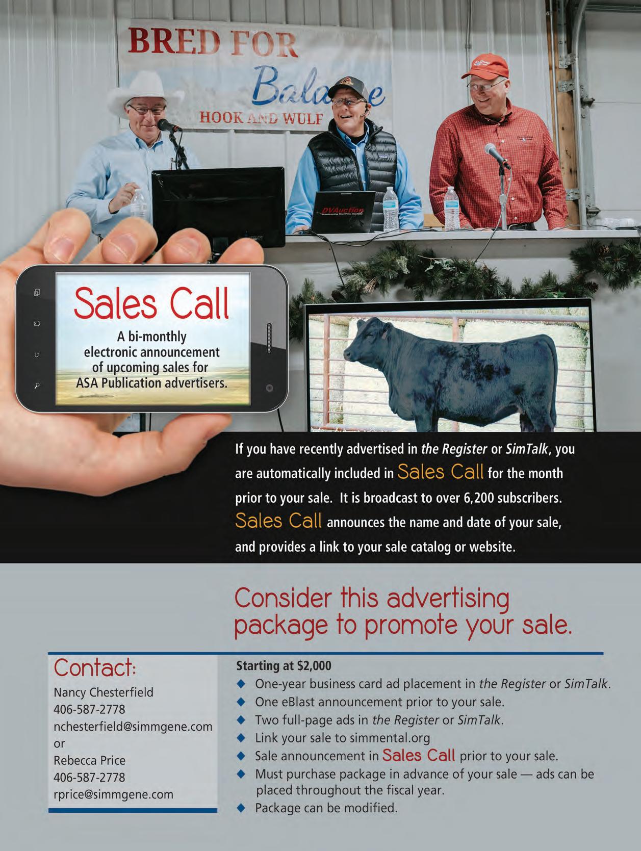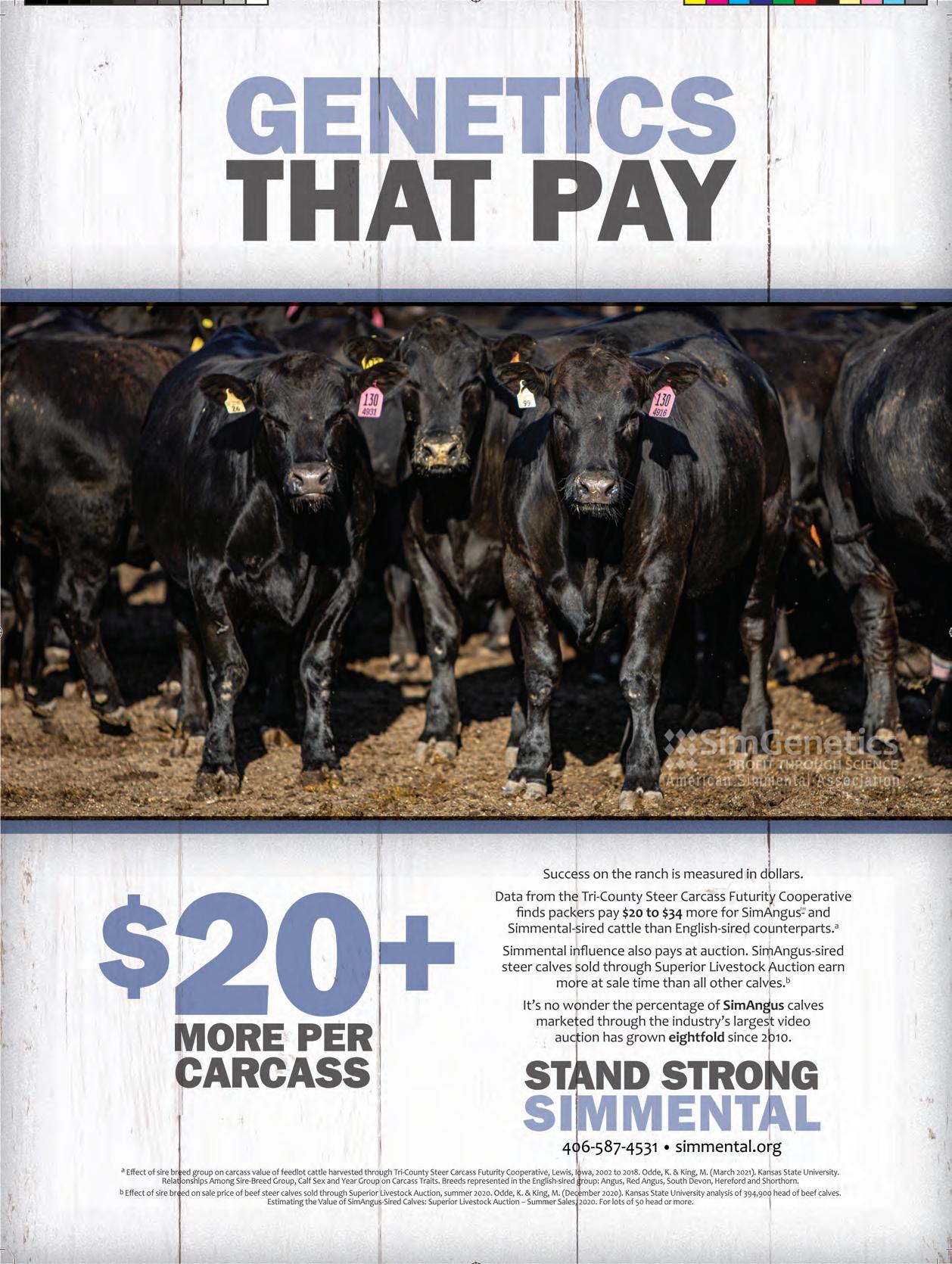 SimTalk is an 81/8 x 107/8-inch publication produced by the Register, the official publication of the American Simmental Association. Published four times annually, SimTalk is a glossy, full-color publication with a circulation that targets commercial users of SimGenetics. Advertising in SimTalk provides a unique opportunity to brand and trademark your program to thousands of potential customers. If you are serious about communicating with the commercial beef business, consider an advertising presence in every one of our four annual issues.