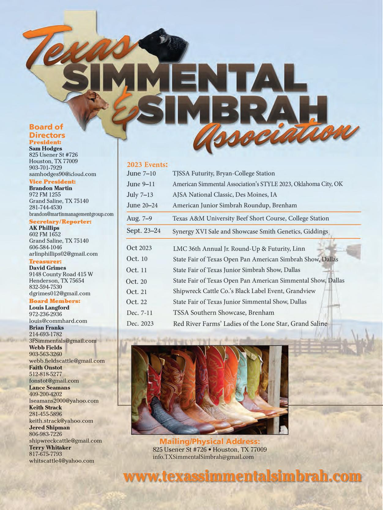 AD INDEX CONTINUED Miscellaneous Affordable Full-Color Catalogs. . . . . . . 43, 187 All Purpose Index ($API). . . . . . . . . . . . . . . 205 American Royal. . . . . . . . . . . . . . . . . . . . . . . 97 America’s Cow More Mean More. . . . . . . . . 205 ASA Publication, Inc.. . . . . . . . . . . . . 3, 21, 43, 93, 185–190, 199 Balance The Scales. . . . . . . . . . . . . . . . . . . IFC Beef Quality Assurance. . . . . . . . . . . . . . . . 118 Best Practices for Seedstock Producers. . . 132 Business Card Ads. . . . . . . . . . . . . . . . . . . . 93 Calf Crop Genomics (CCG). . . . . . . . . 133, 197 Carcass Expansion Project (CXP). . . . . . . . 133 Carcass Merit Program (CMP). . . . 10, 155, 180 Cattlemen’s Congress. . . . . . . . . . . . . . . . . . 97 Check Us Out Online. . . . . . . . . . . . . . . . . . . . 2 Cow Herd DNA Roundup (CHR). . . . . . . . . 133 Customer Service Team. . . . . . . . . . . . . . . . . 37 Digital Promotion. . . . . . . . . . . . . . . . . . . 21, 89 Genetics That Pay. . . . . . . . . . . . . . . . . . . . 117 Greater Good. . . . . . . . . . . . . . . . . . . . . . . . . 13 Fall Focus. . . . . . . . . . . . . . . . . . . . . . . . . 4, 199 Fort Worth Stock Show & Rodeo. . . . . . . . . . 97 If Beef Is Your Business. . . . . . . . . . . . . . . . 155 IGS Multi-breed Genetic Evaluation. . . . . . 132 Media Kit. . . . . . . . . . . . . . . . . . . . . . . 185–190 National Classic. . . . . . . . . . . . . . . . . . . . . . . 59 National Western Stock Show. . . . . . . . . . . . 97 No Magic Beans. . . . . . . . . . . . . . . . . . . . . . . 5 North American International Livestock Expo. . . . . . . . . . . . . . . . . . . . . 97 Performance Advocate Program. . . . . . 10, 20, 27, 104, 124, 178, 180 Progress Through Performance (PTP). . . 96–97 Regional Classics. . . . . . . . . . . . . . . . . . . . . 59 Reserve Your Ad Space. . . . . . . . . . . . . . . . 199 Ring of Champions (PTP). . . . . . . . . . . . . 96–97 Sales Call. . . . . . . . . . . . . . . . . . . . . . . . . . . . . 3 SimGenetics Profit Through Science. . . . IFC, 5, 54, 77, 89, 117, 155, 186, 203 SimTalk . . . . . . . . . . . . . . . . . . . . . . . . . 185–190 Sire Source. . . . . . . . . . . . . . . . . . . . . 185–190 Stay Ability. . . . . . . . . . . . . . . . . . . . . . . . . . . 77 Steer Profitability Contest. . . . . . . . . . . . 54–55 Summit Leadership Conference. . . . . . . . . . 59 Terminal Index ($TI). . . . . . . . . . . . . . . . . . . 205 the Register . . . . . . . . . . . . . . . . . . . . . 185–190 Total Herd Enrollment (THE). . . . . . . . 5, 10, 20, 44, 101, 104, 118, 122, 126, 127, 133, 141, 146, 162, 178, 180, 182, 203 Your Data. His Future.. . . . . . . . . . . . . . . . . 203 Texas (continued) Shipwreck Cattle Company. . . . . . . . . . . . . 207 Simmentals of Texas Fleckvieh Advantage. . . . . . . . . . . . . . . . 174 Smith Genetics. . . . . . . . . . . . . . . . . . . . . . 174 Synergy Sale. . . . . . . . . . . . . . . . . . . . . . . . 174 Texas Simmental Simbrah Association. . . . 163 Utah Yardley Cattle Co.. . . . . . . . . . . . . . . . . . . . 177 Virginia Deer Creek Farm. . . . . . . . . . . . . . . . . . . . . 178 McDonald Farms. . . . . . . . . . . . . . . . . . . . . 180 Virginia Beef Expo. . . . . . . . . . . . . . . . . . . . 179 Virginia Simmental Association. . . . . . . . . . 179 Washington Matheson Farms Simmental. . . . . . . . . . . . 182 Trinity Farms. . . . . . . . . . . . . . . . . . . . . . . . 183 Washington Simmental Association. . . . . . 181 Wisconsin ABS® . . . . . . . . . . . . . . . . . . . . . 1, 11, 146, 159 GENEX™. . . . . . . . . . . . . . . . . . . . . . . . 11, 159 Wisconsin Simmental Association. . . . . . . . 193 Wyoming Black Summit Cattle. . . . . . . . . . . . . . . . . . 195 Associations Alabama Simmental Association. . . . . . . . . . . 9 American Junior Simmental Association. . . . . . . . . 54, 55, 59 American Simmental Association. . . . . . IFC, 2, 4, 5, 13, 19, 21, 37, 54, 77, 83, 85, 89, 117, 132, 155, 196, 197, 199, 203, 205 American Simmental-Simbrah Foundation. 199 Colorado Simmental Association. . . . . . . 4, 19 Florida Junior Simmental Association. . . . . . 23 Florida Simmental Association. . . . . . . . . . . 23 Georgia Simmental Simbrah Association. . . 25 Idaho Simmental Association. . . . . . . . . . . . 29 Illinois Simmental Association. . . . . . . . . . . . 31 Indiana Simmental Association. . . . . . . . . . . 41 International Genetic Solutions (IGS). . . . . . . 13 Iowa Junior Simmental Association. . . . . . . . 49 Iowa Simmental Association. . . . . . . . . . . . . 49 Kansas Simmental Association. . . . . . . . . . . 63 Kentucky Simmental Association. . . . . . . . . 71 Louisiana Simmental-Simbrah Association. . . . . . . . . . . . . . . . . . . . . . . . 79 Michigan Simmental Association. . . . . . . . . . 81 Minnesota Simmental Association. . . . . . . . 85 Missouri Simmental Association. . . . . . . . . . 95 Montana Simmental Association. . . . . . . . . 103 Nebraska Simmental Association. . . . . . . . 109 New York Simmental Association. . . . . . . . 119 North Carolina Simmental Association. . . . 121 North Dakota Junior Simmental Association. . . . . . . . . 123 North Dakota Simmental Association. . . . . 123 Ohio Simmental Association. . . . . . . . . . . . 129 Oklahoma Simmental Simbrah Association. . . . . . . . . . . . . . . . . . . . . . . 137 Pennsylvania Simmental Association. . . . . 143 South Dakota Simmental Association. . . . . 147 Tennessee Simmental/Simbrah Association. . . . . . . . . . . . . . . . . . . . . . . 157 Virginia Simmental Association. . . . . . . . . . 179 Washington Simmental Association. . . . . . 181 Wisconsin Simmental Association. . . . . . . . 193 Livestock Services ABS® . . . . . . . . . . . . . . . . . . . . . 1, 11, 146, 159 Agri-Media Livestock Group. . . . . . . . 106, 127 Agri-Best Feeds. . . . . . . . . . . . . . . . . . 106. 127 ALL Beef