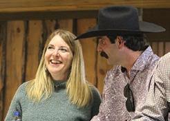Data Genie’s Leoma Donsbach (left) visits with Jerrid Brisendine of Far Out Cattle Ranch.