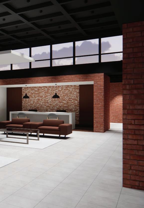 Description: This clubhouse was designed in an industrial style, with spaces arranged around a central courtyard that brings in natural light, greenery, and outdoor views. The clubroom and fitness room face the swimming pool to take advantage of poolside views, while the lobby, mailroom, and restrooms are located along the street side for convenience. The design features concrete floor tiles, exposed brick walls, and a coffered ceiling with a dark metallic finish. Lighting fixtures with dark metal accents were chosen to highlight the industrial character of the space.