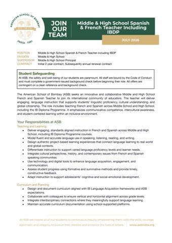 At ASB, the safety and well-being of our students are paramount All staff are bound by the Code of Conduct and must complete a government-issued background check before beginning their role All offers are contingent on a clean reference and background check