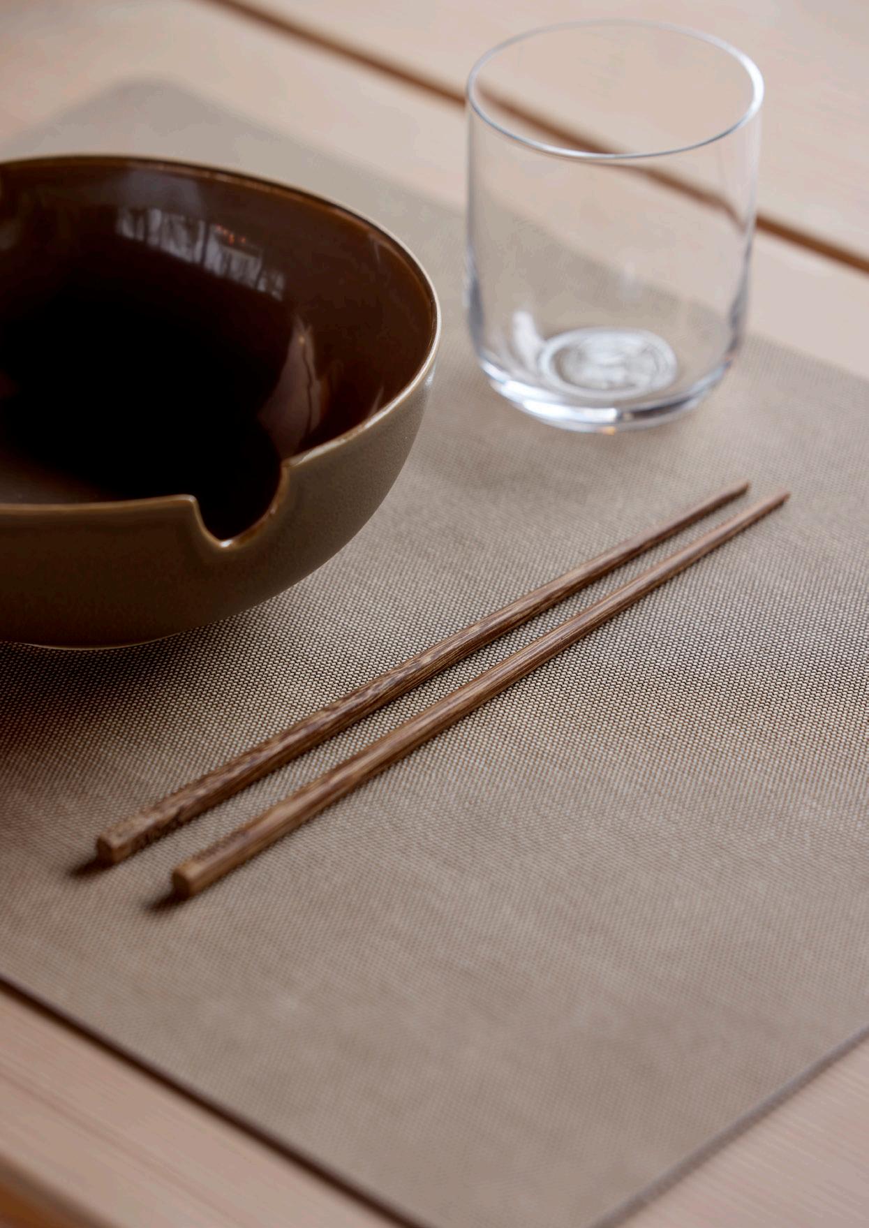 The colours reflect the browns, greens and beiges of the Shoku range, with an added subtlety in that the light side of the placemat contrasts beautifully with the dark side. This softens the look of the table and brings the meal to life without compromising on aesthetics. The reversible placemats are practical and easy to clean with a cloth.
